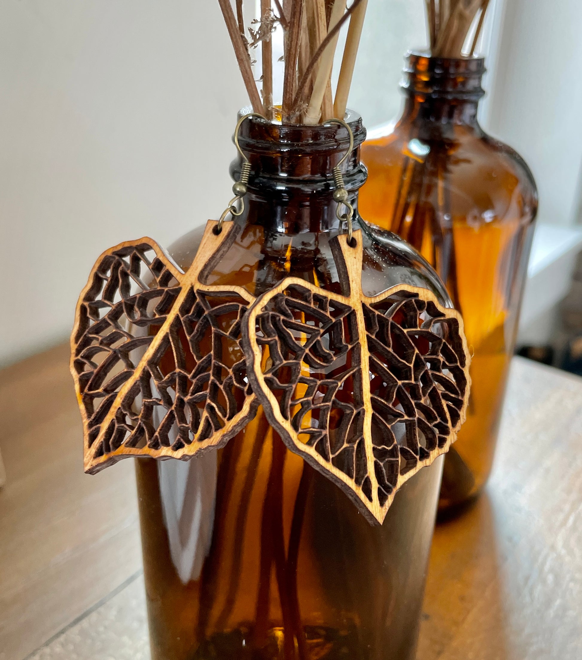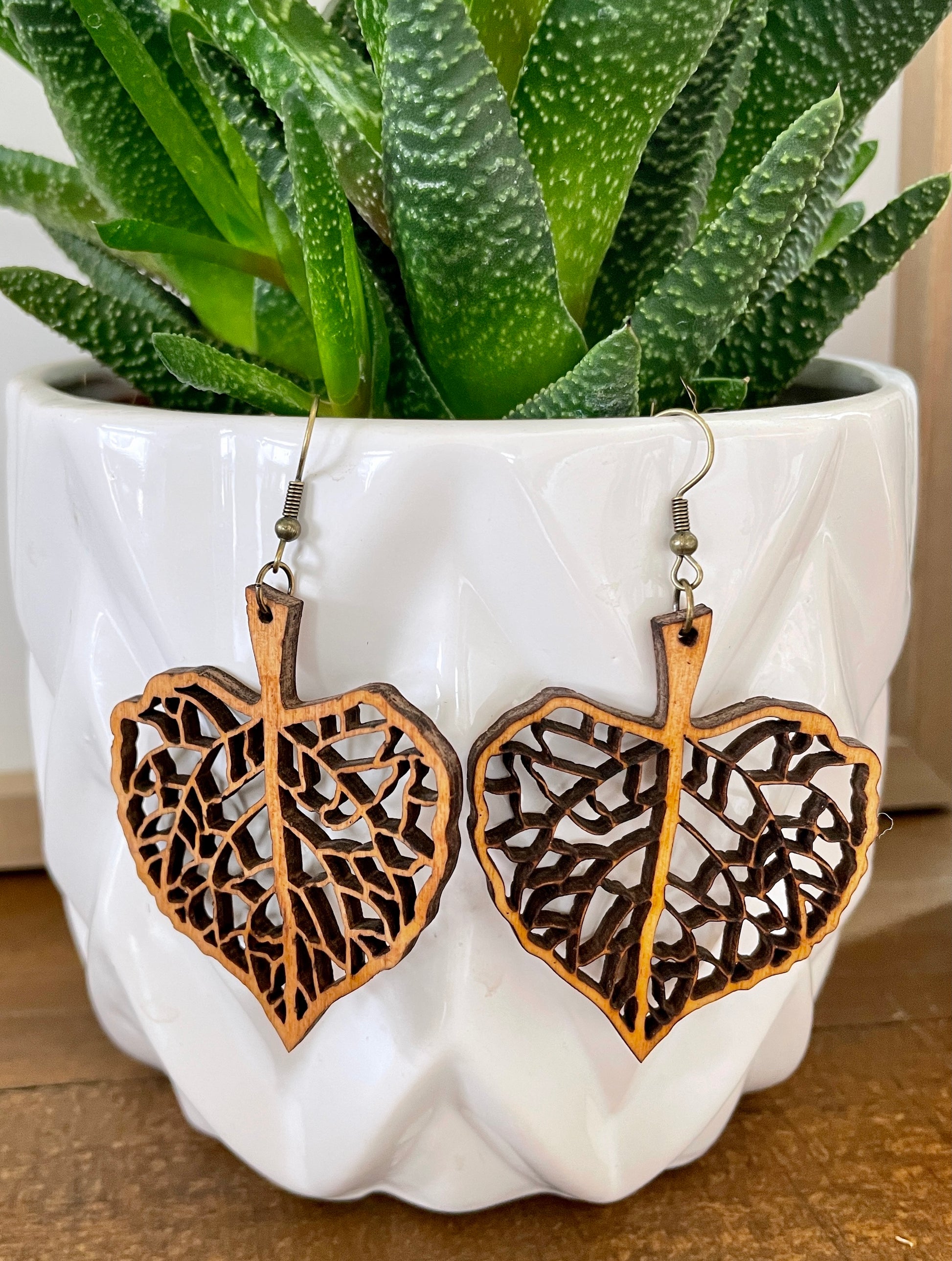 Beautiful, lightweight, brown toned, laser cut wooden earrings. Pair perfectly with any outfit, dressy or casual! Super lightweight and comfortable. Measures 2 1/4 x 2”.