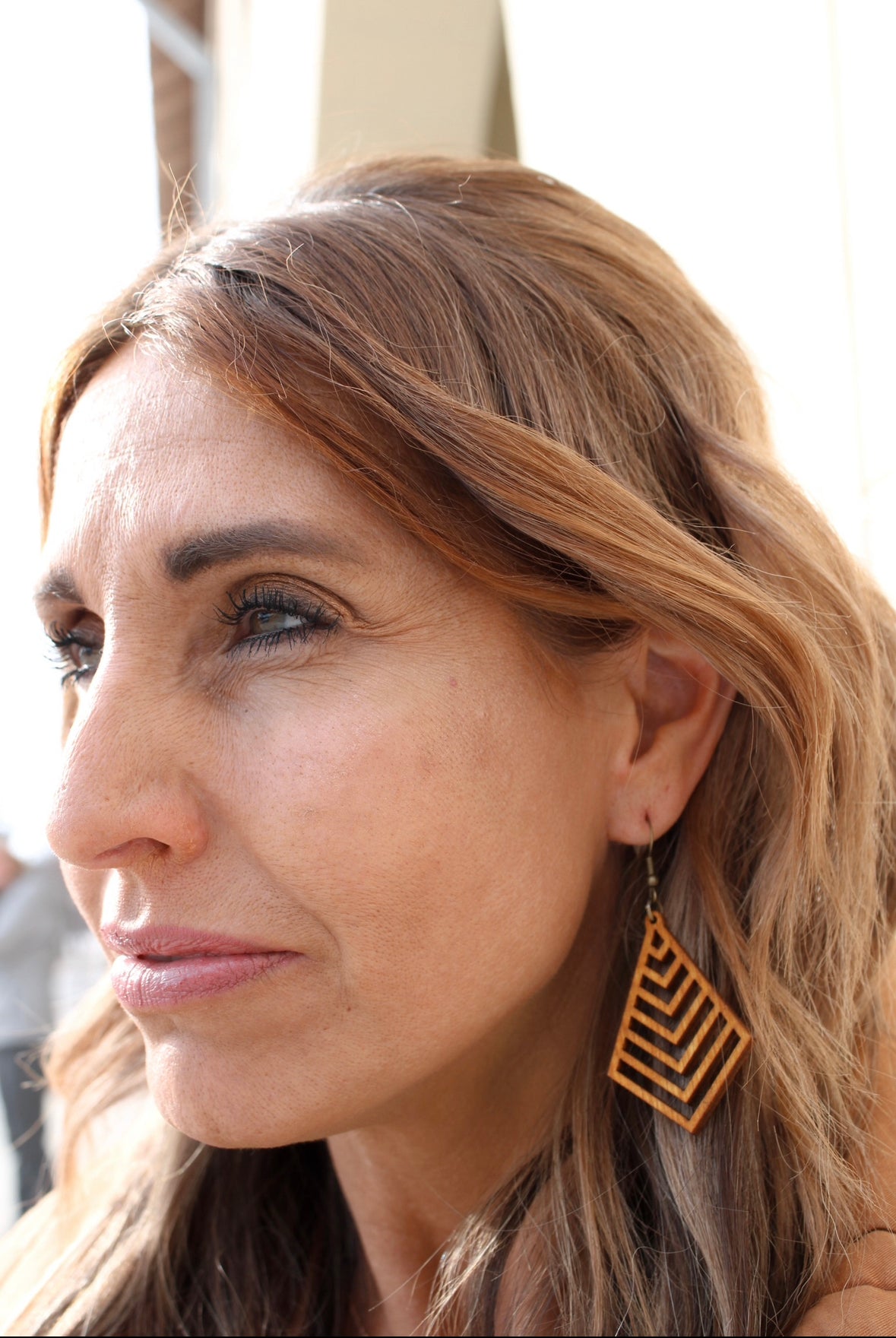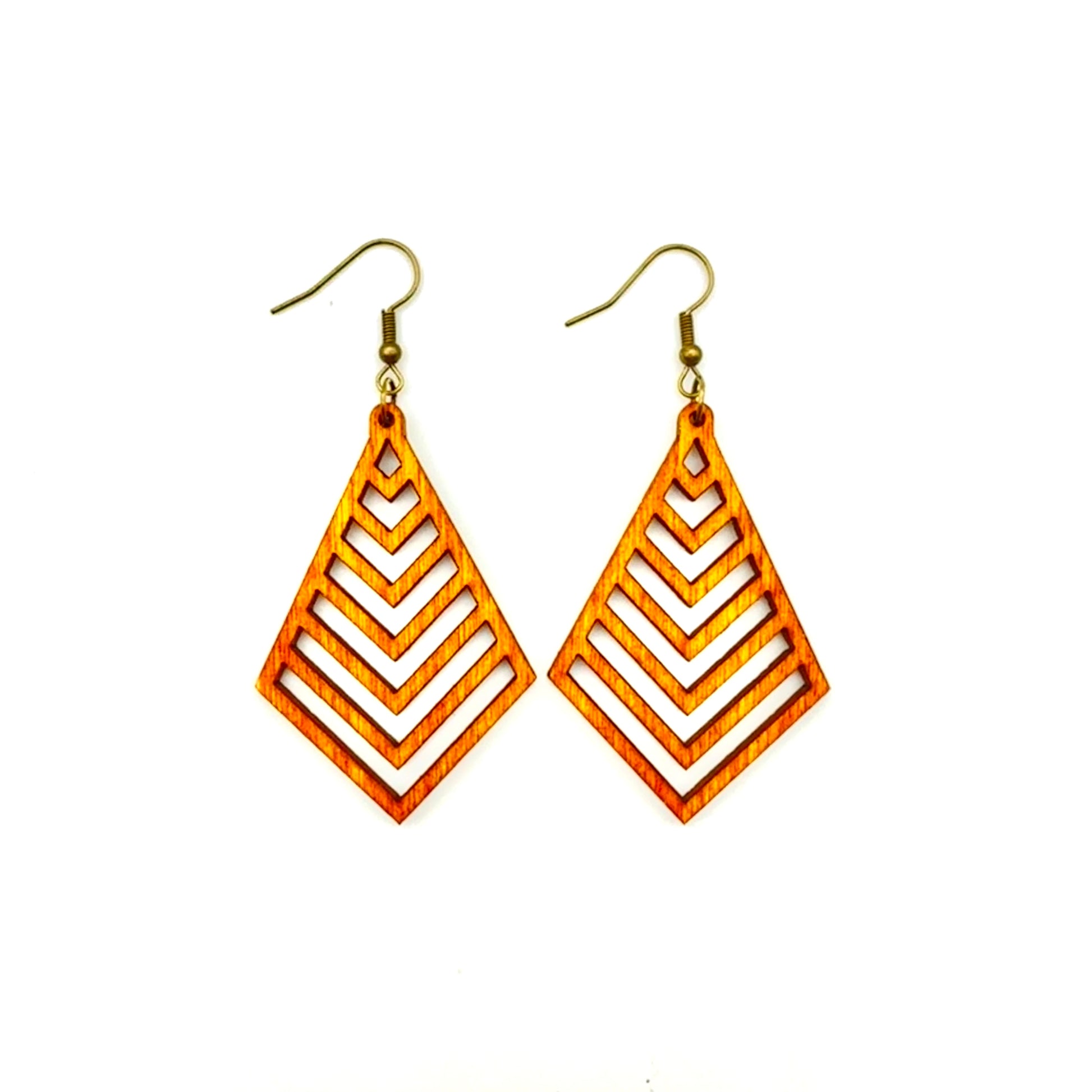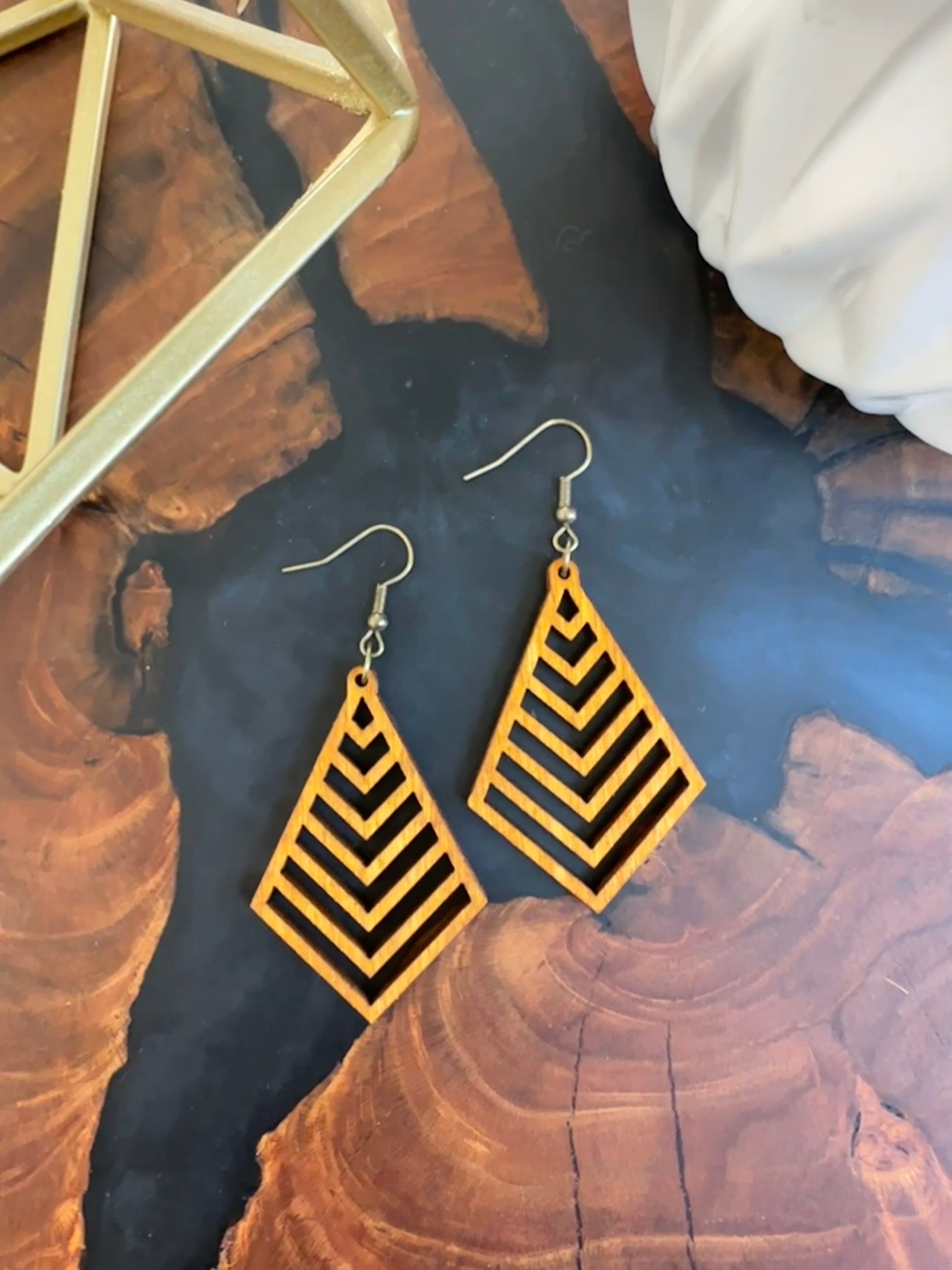 Taking inspiration from the clean lines and perfect patterns of the cobblestone streets, these lightweight, wood earrings are sure to dress up any outfit. The intricate design creates a beautiful statement piece. These original designs are finished with an amber gold dye stain, and sealed with teak oil. Like all of our earrings, they are made with high quality, nickel free, hypoallergenic, components.. Measures 2” x 1.5”.