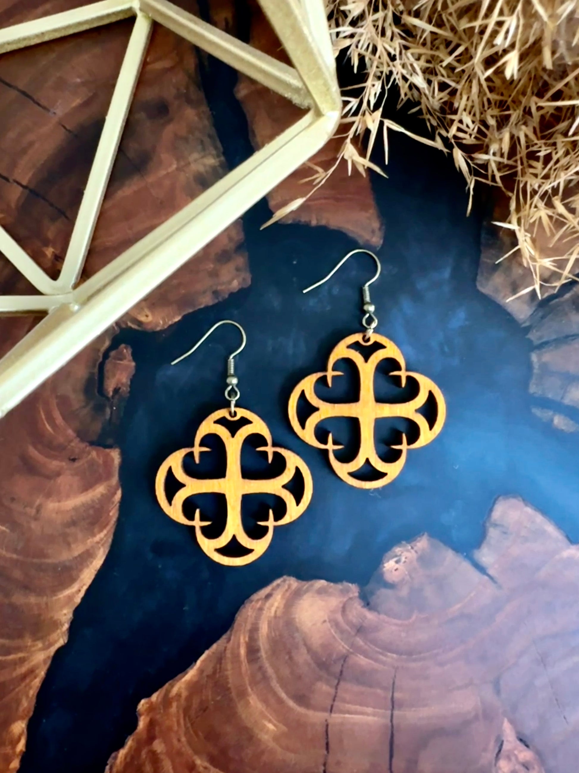 Castello (Italian for castle) was the inspiration behind these gothic inspired earrings. These lightweight, wood earrings are sure to dress up any outfit. The symmetry and geometric design creates a beautiful statement piece. These original designs are finished with an amber gold dye stain, and sealed with teak oil. Like all of our earrings, they are made with high quality, nickel free, hypoallergenic, components.. Measures 1.5” x 1.5”.