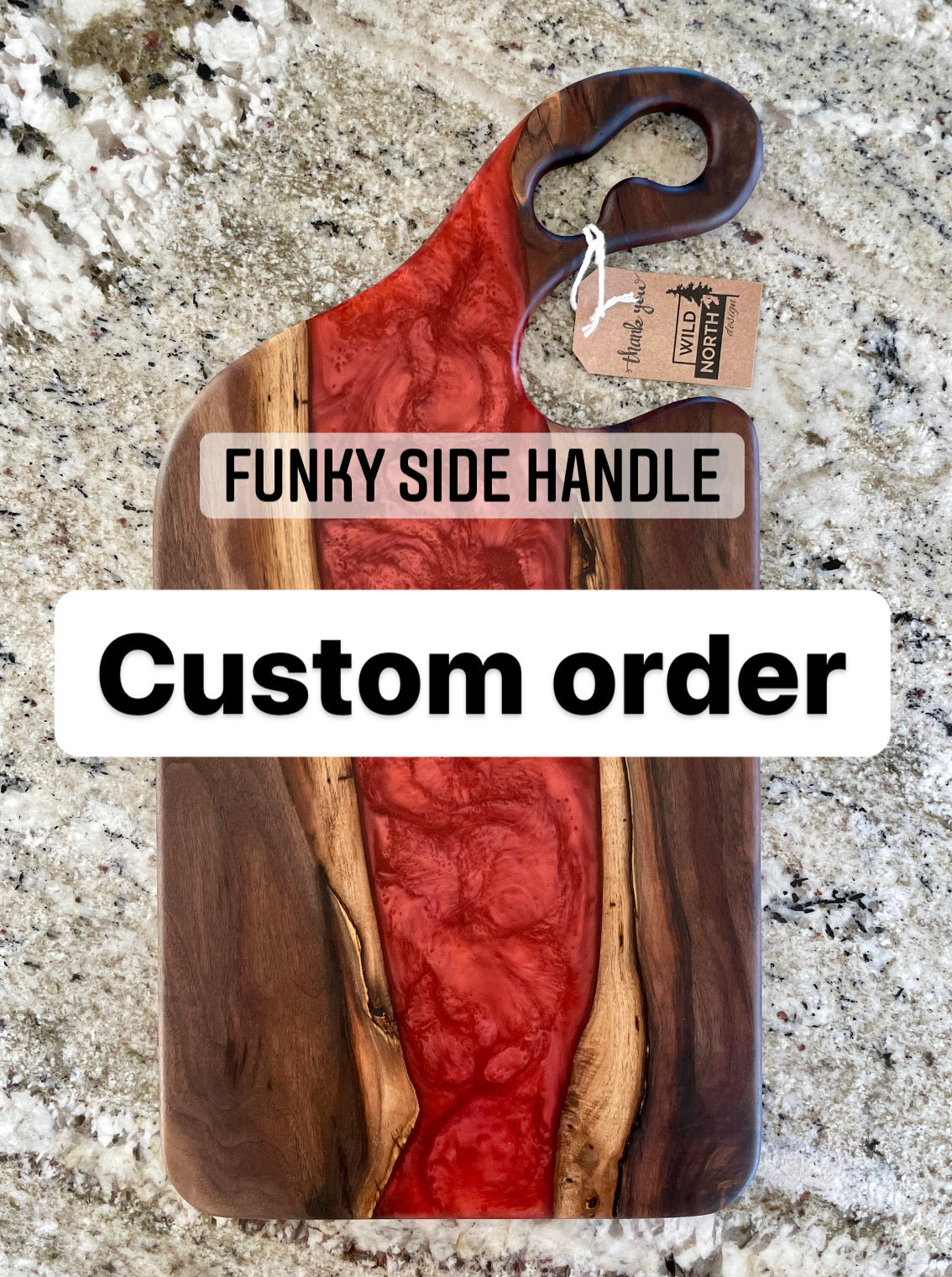 Custom Walnut board (funky side handle) with your choice of colored resin