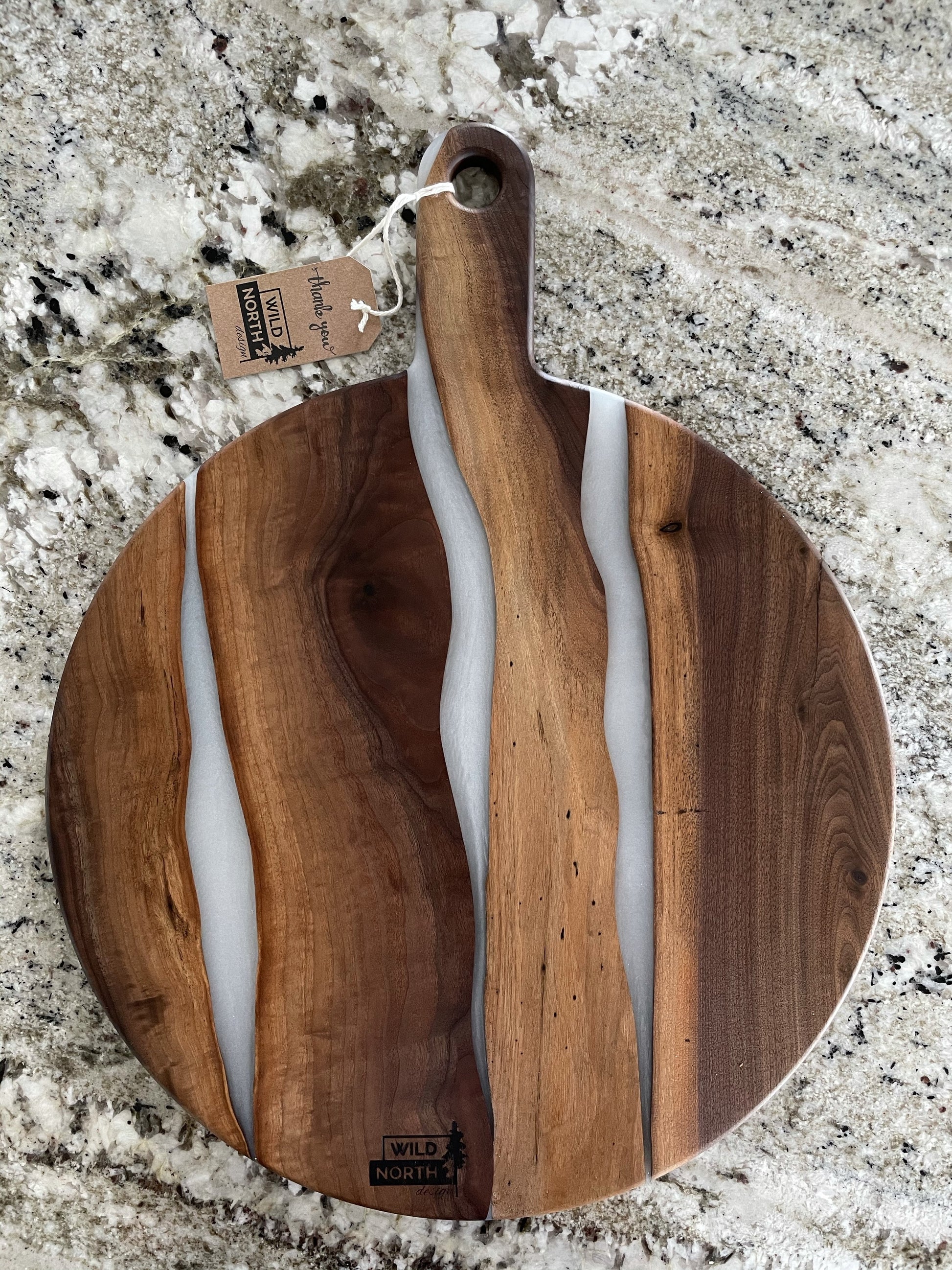 Custom round walnut with epoxy board. Traditional handle. Perfect for serving appetizers, cheese or desserts.