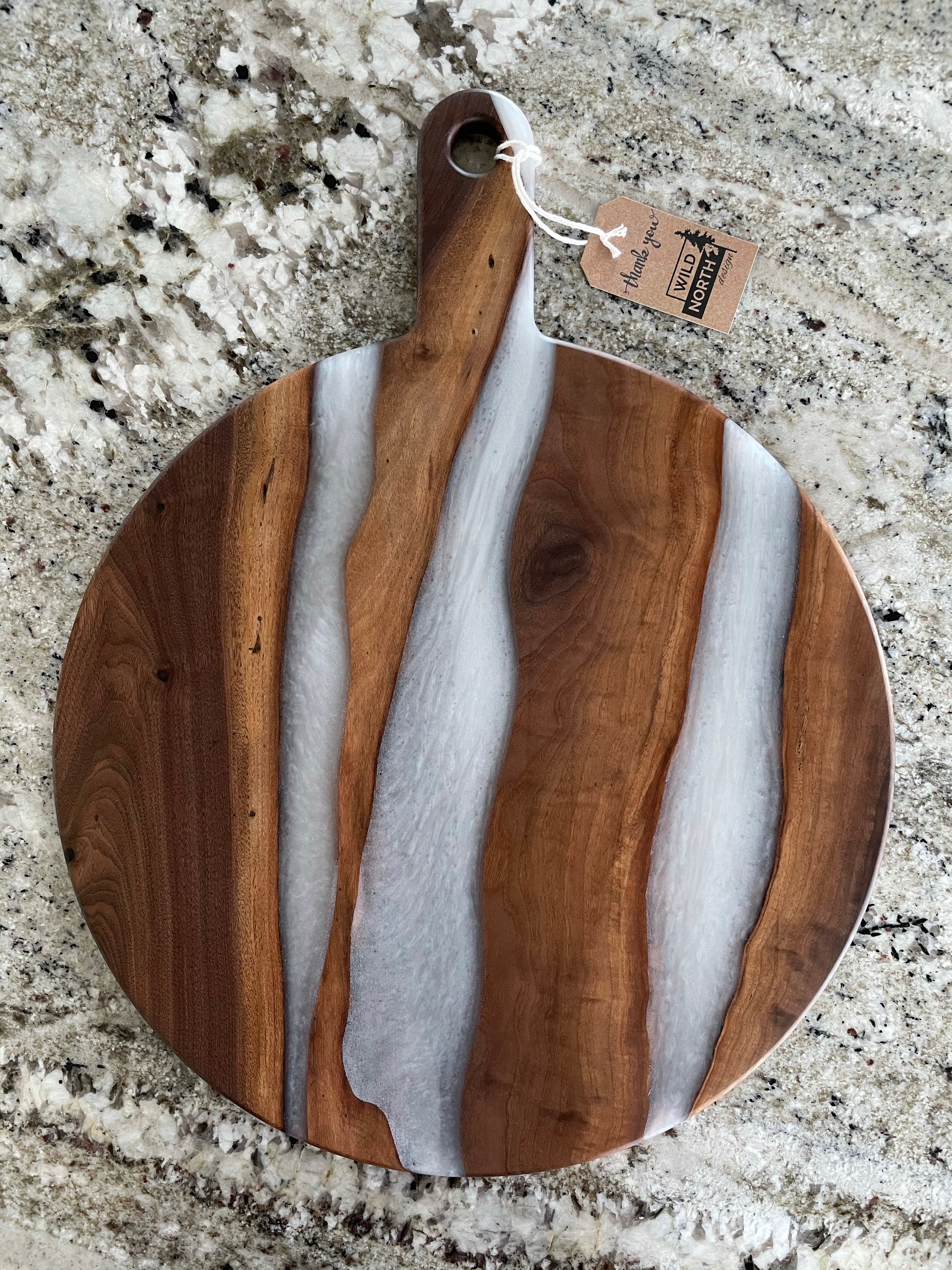 Custom round walnut with epoxy board. Traditional handle. Perfect for serving appetizers, cheese or desserts.