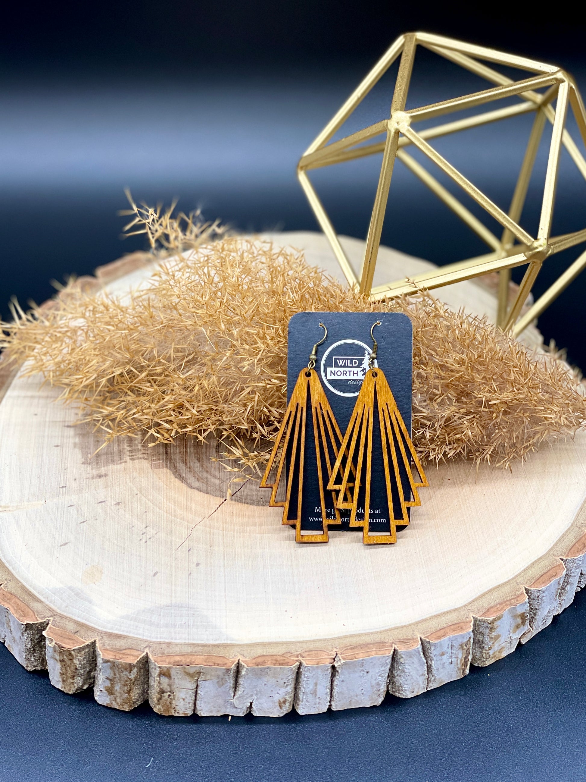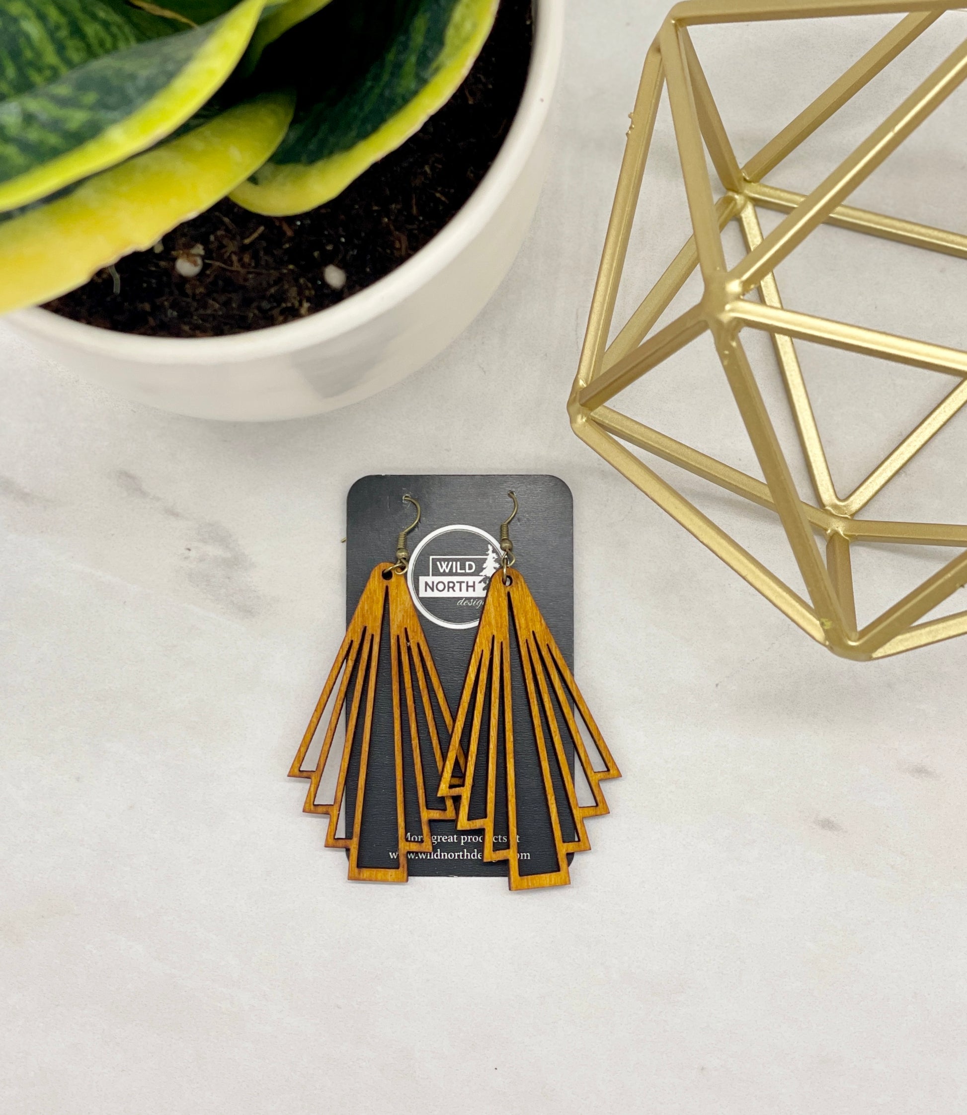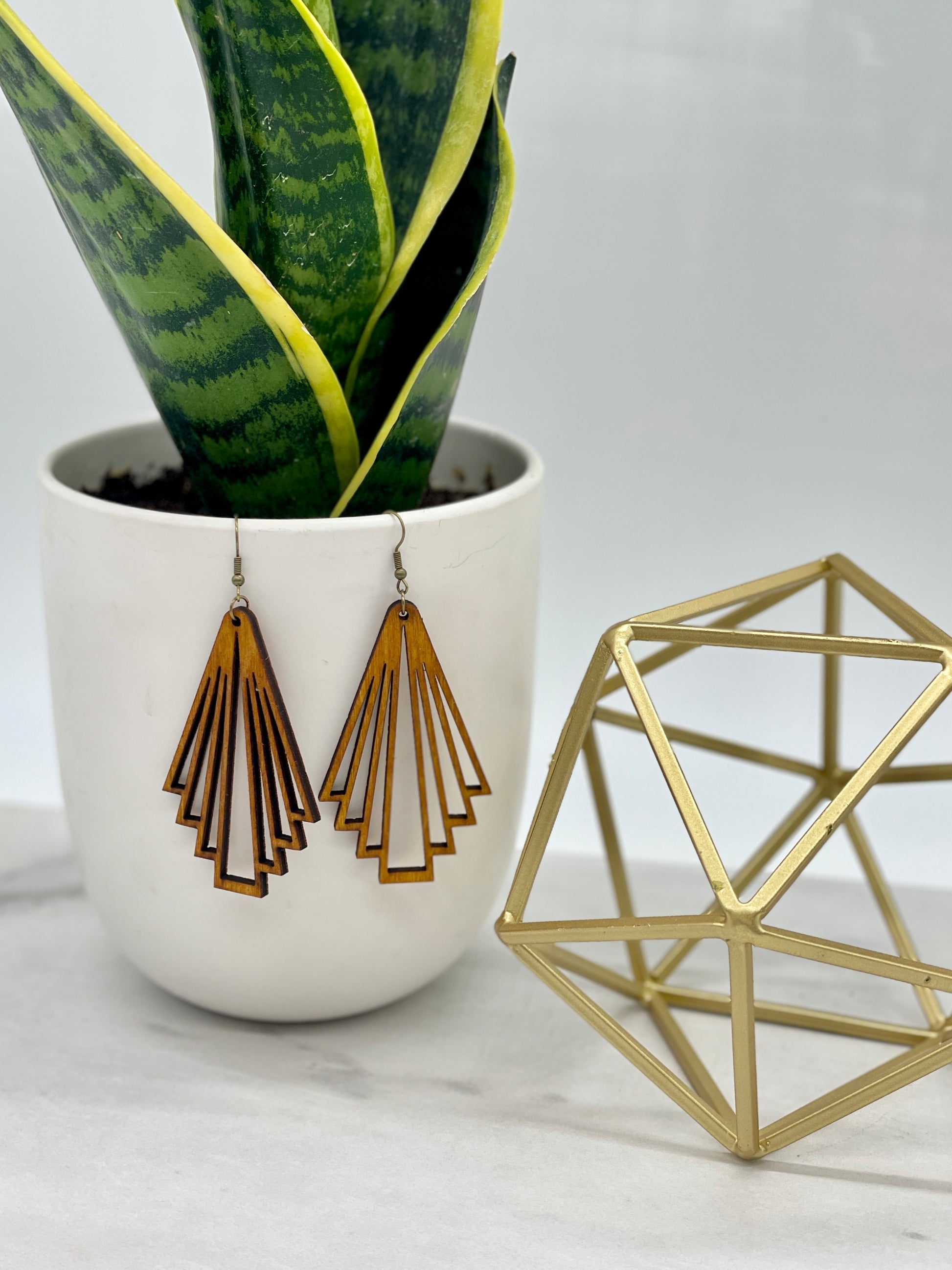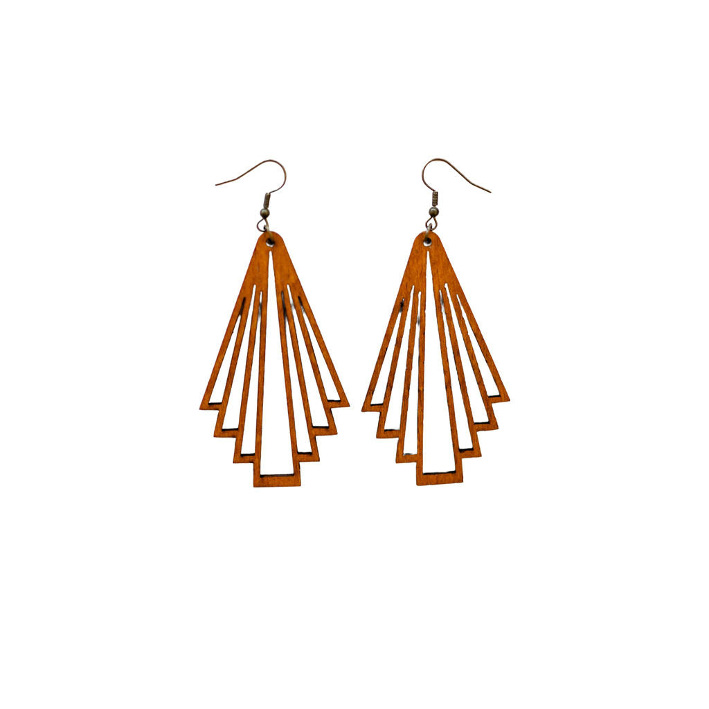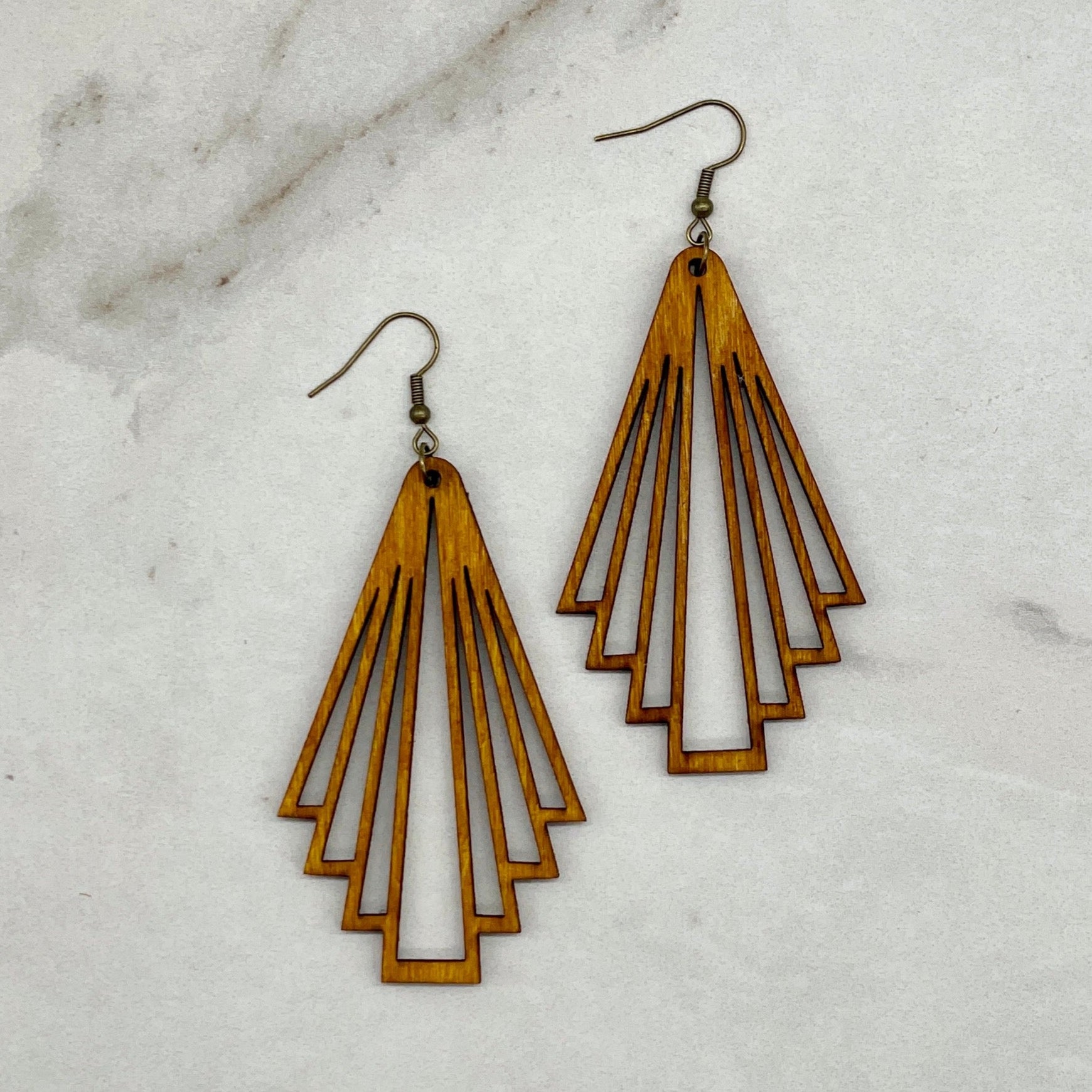 Taking inspiration from the beautiful architecture of the art deco era, these lightweight, wood earrings are sure to dress up any outfit. While the lines are simple and geometric, each one is a detailed, beautiful statement piece. These original designs are finished with an amber gold dye stain, and sealed with teak oil. Like all of our earrings, they are made with high quality, nickel free, hypoallergenic, components.. Measures 2 3/4x 1 1/2”.