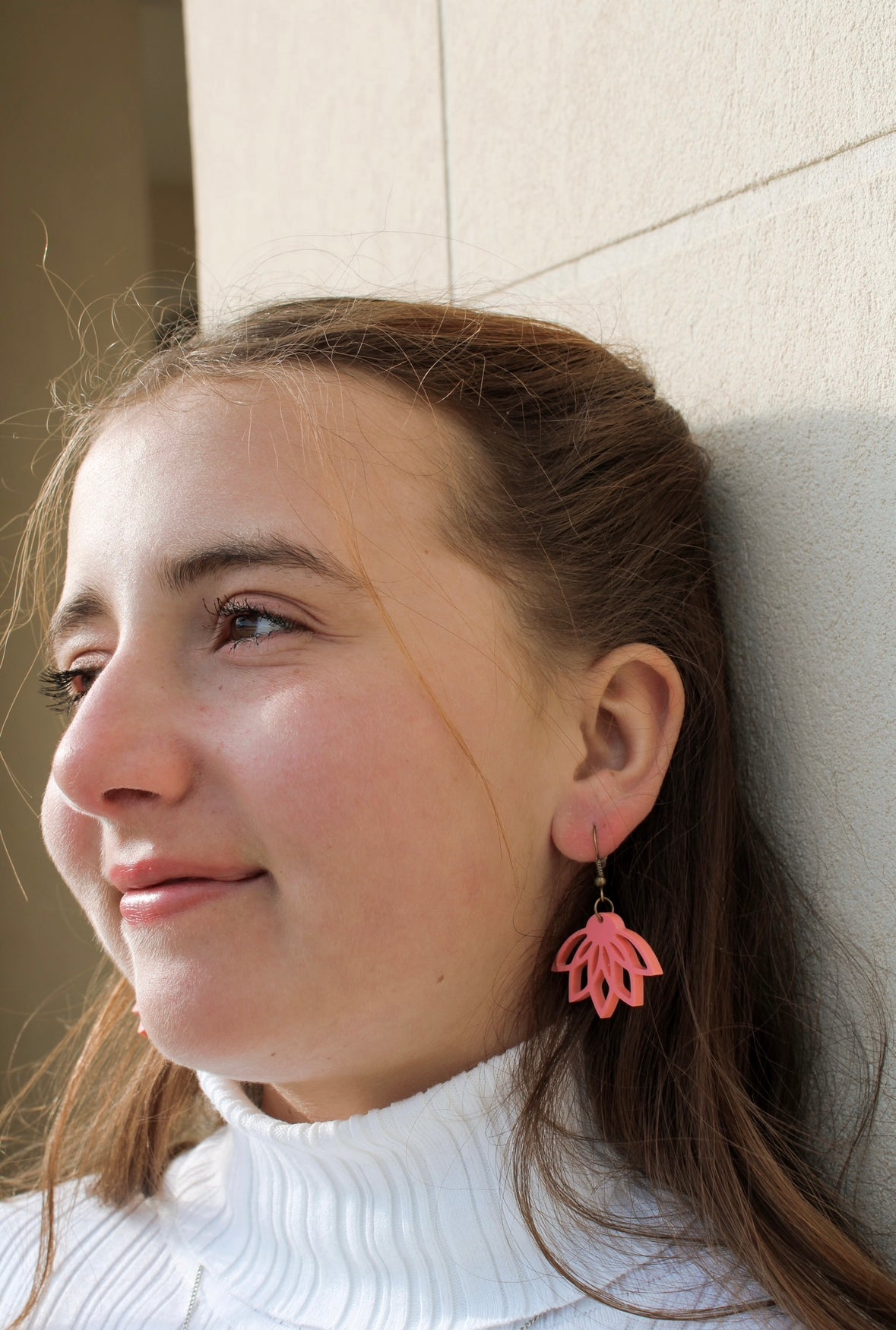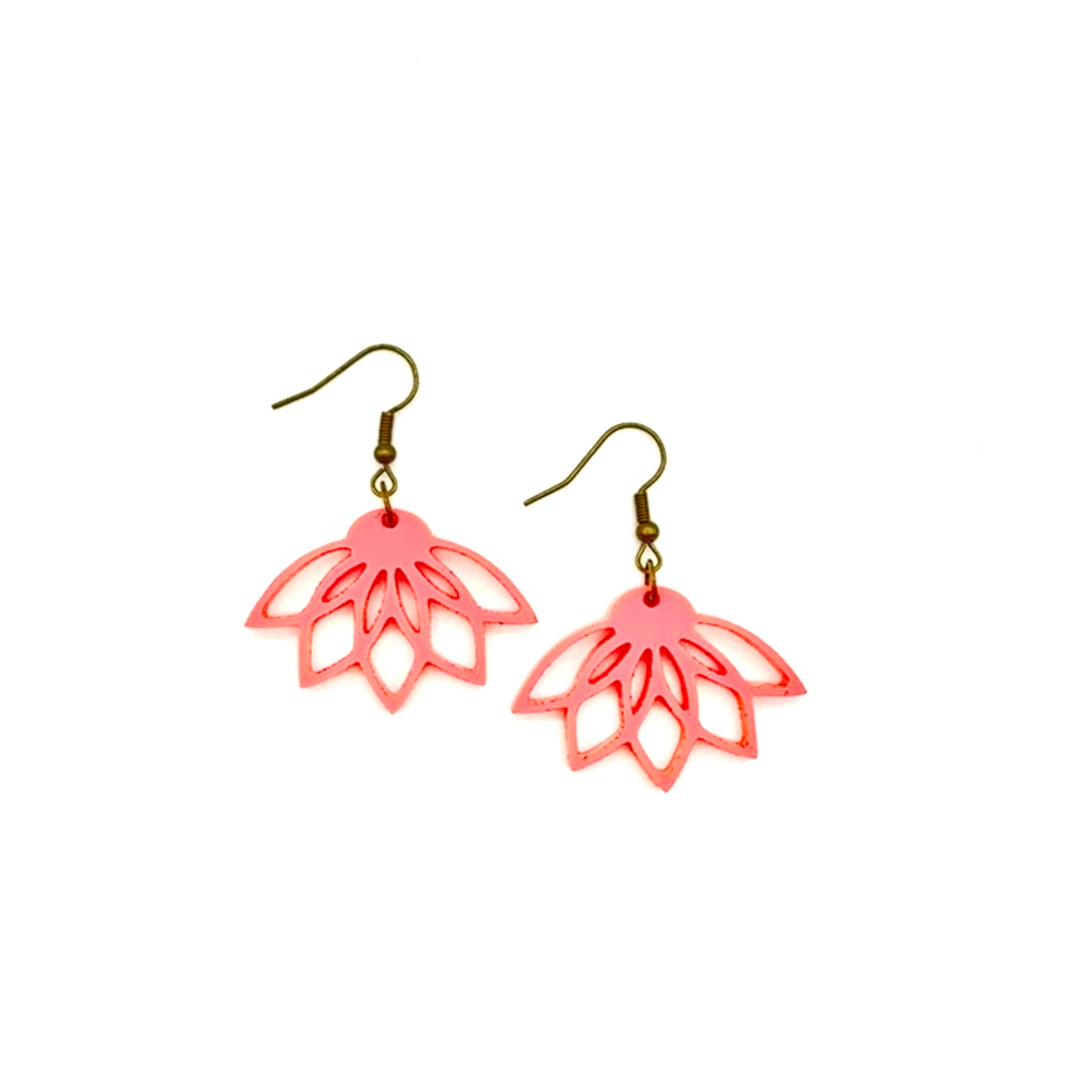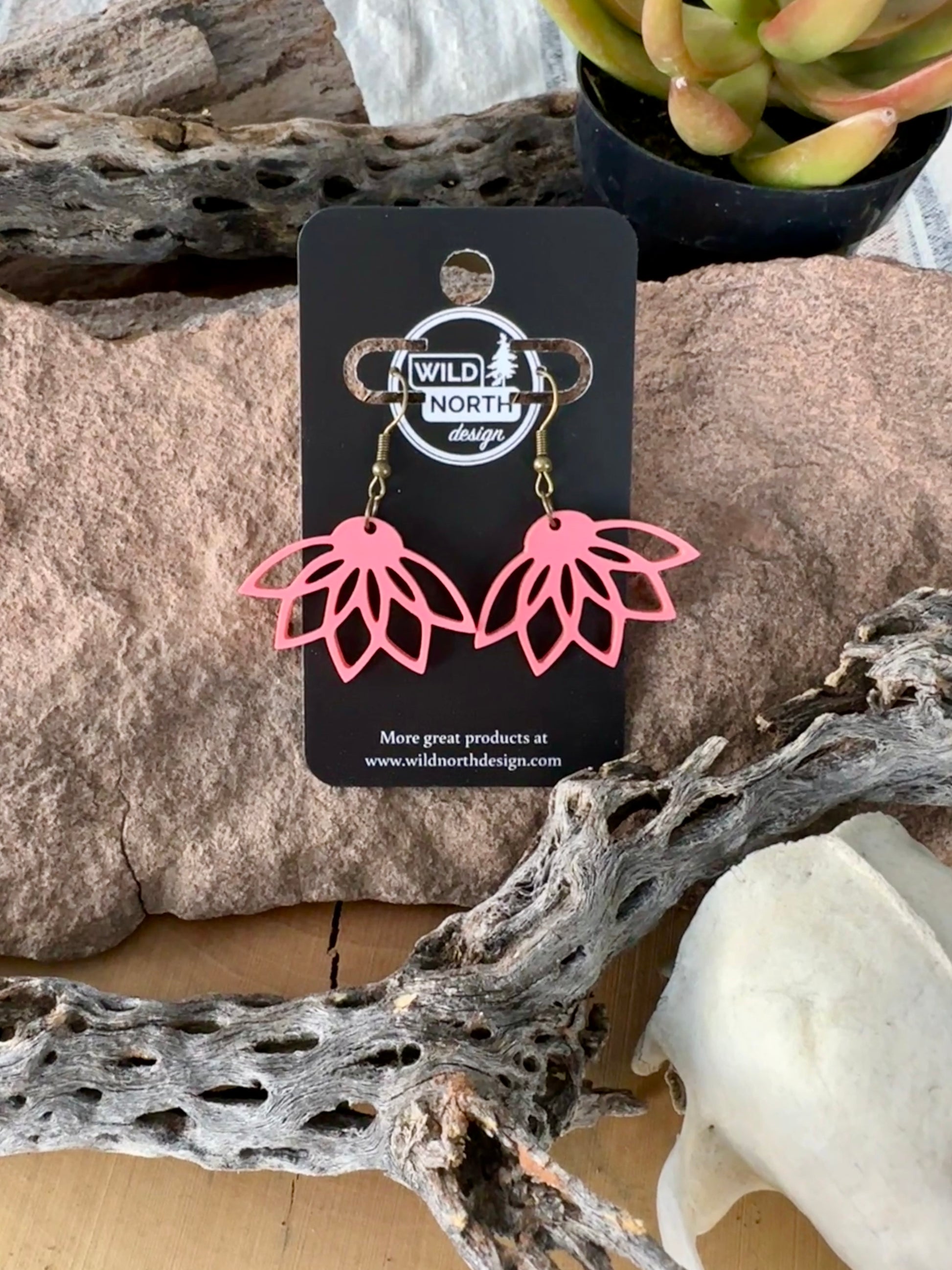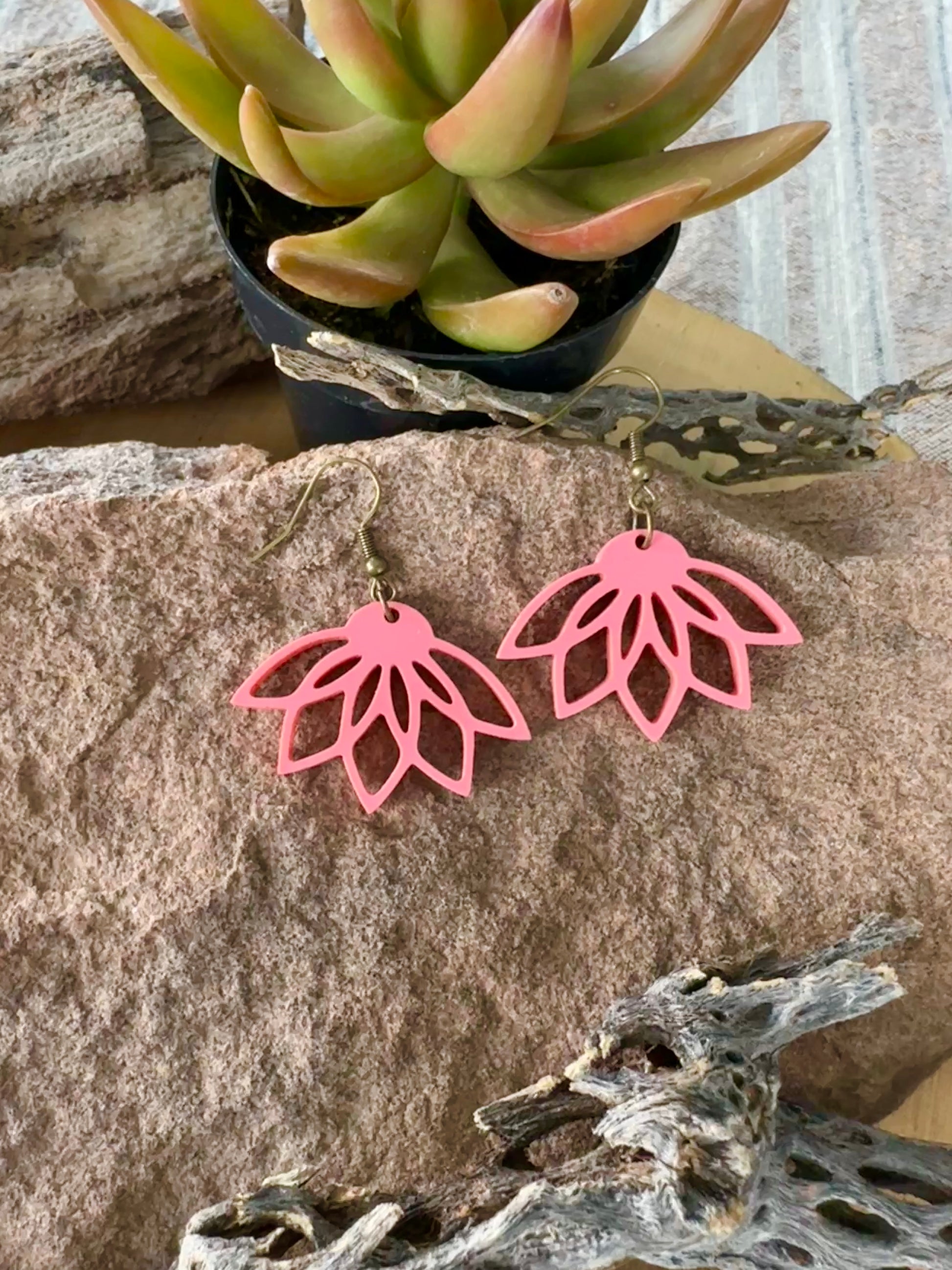 Flowers blooming in the desert is more beautiful against the barren landscape. These original designs are cut from coral pink acrylic. Like all of our earrings, they are made with high quality, nickel free, hypoallergenic, components.. Measures 1.25” x 1.25”.
