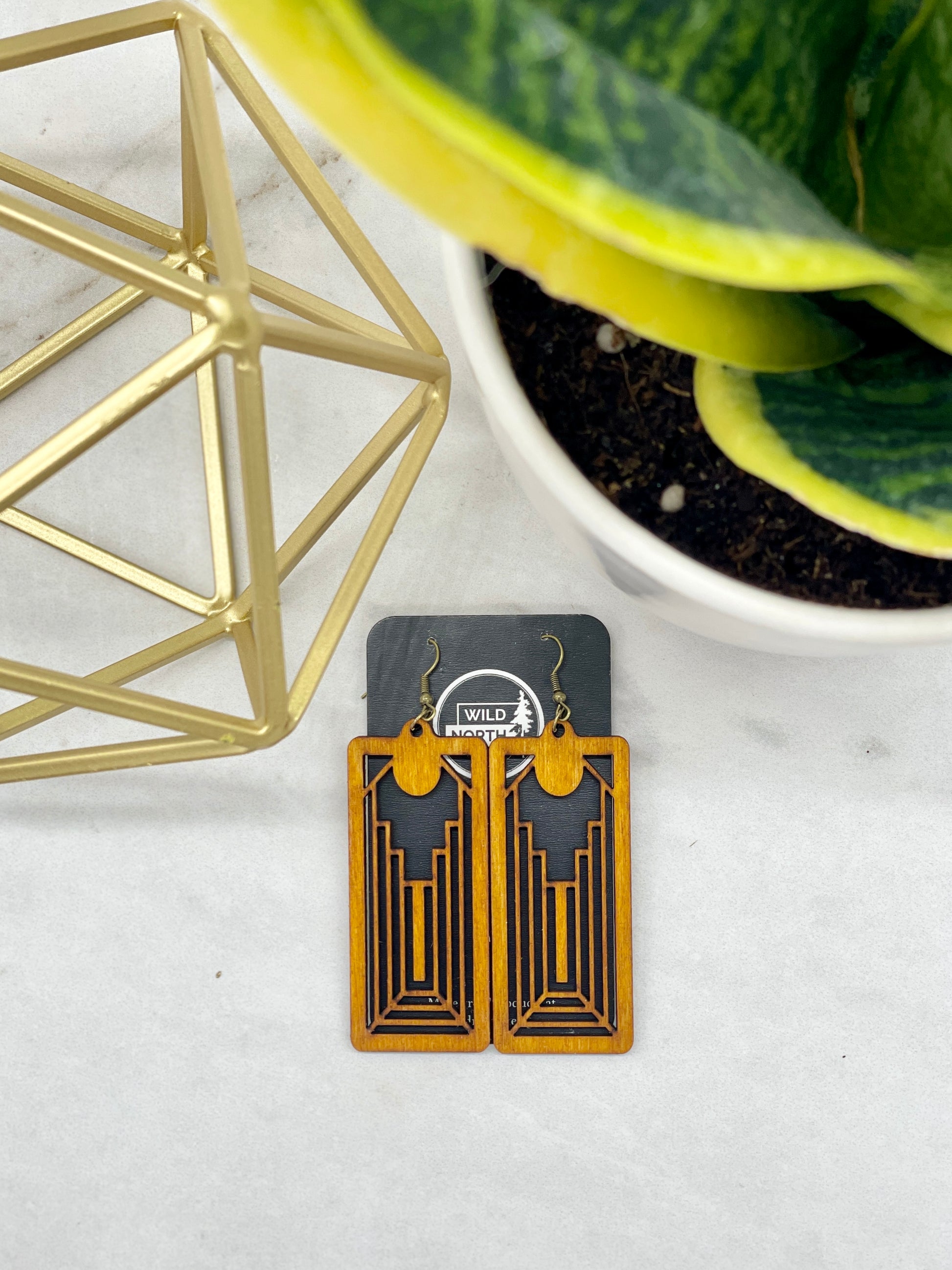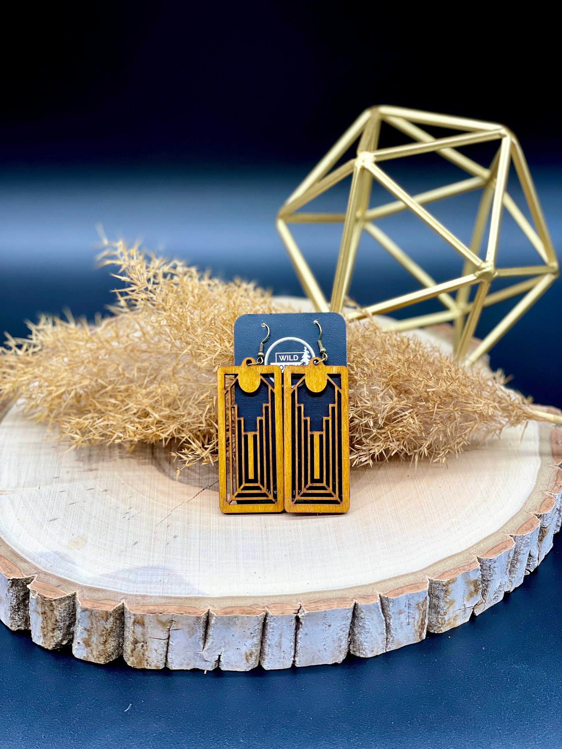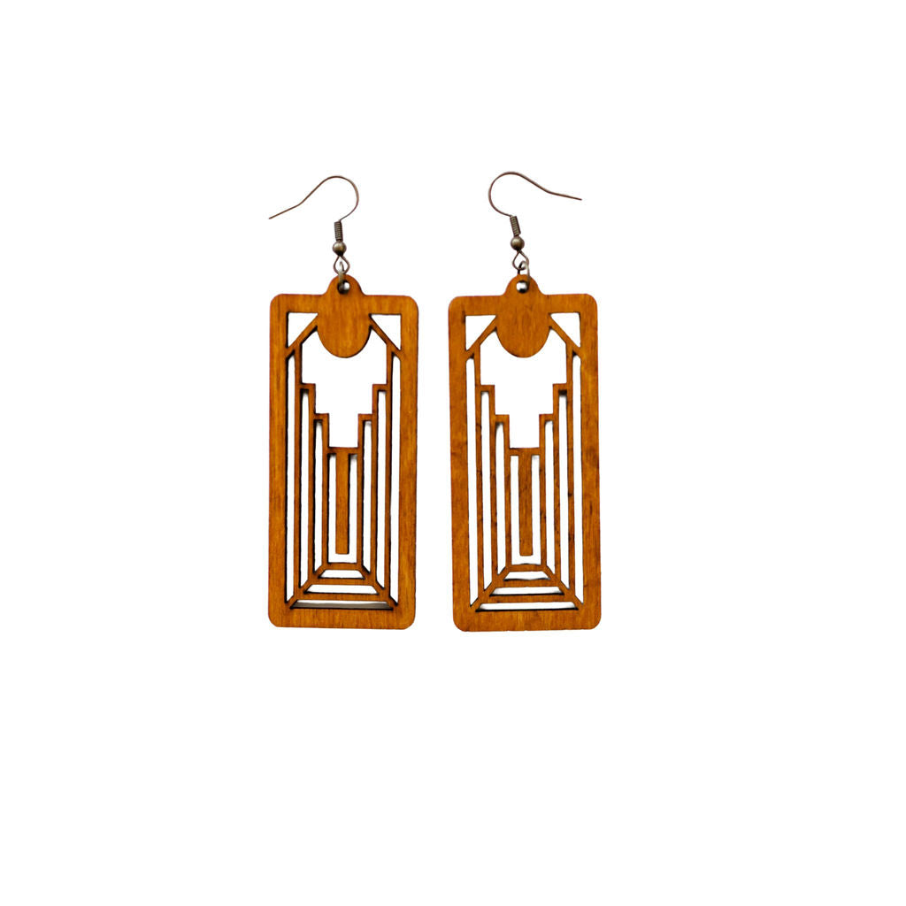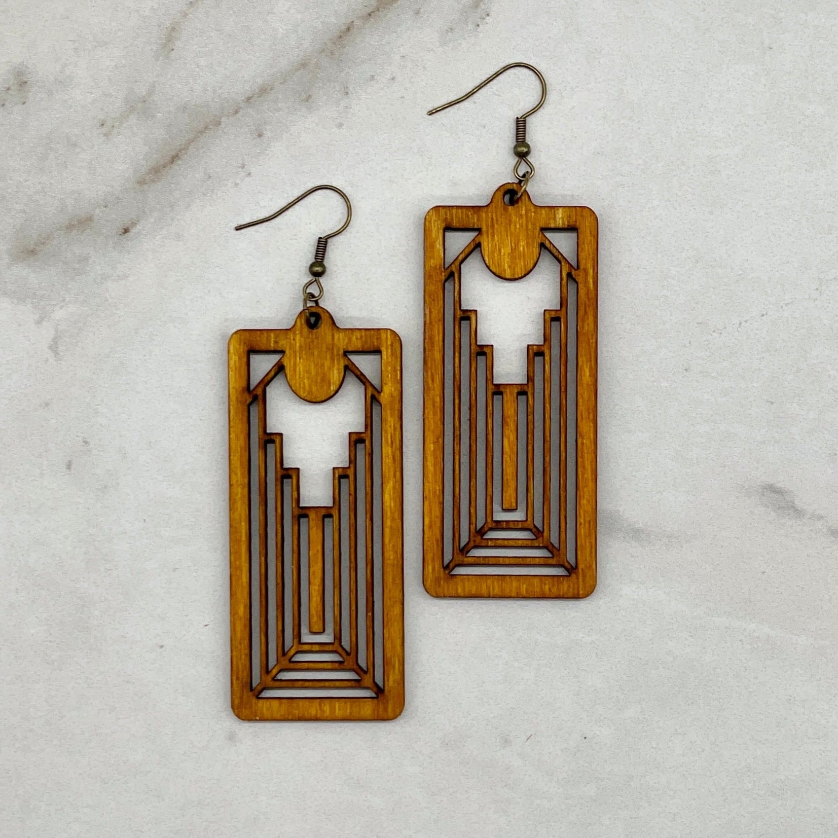 Taking inspiration from the beautiful architecture of the art deco era, these lightweight, wood earrings are sure to dress up any outfit. While the lines are simple and geometric, each one is a detailed, beautiful statement piece. These original designs are finished with an amber gold dye stain, and sealed with teak oil. Like all of our earrings, they are made with high quality, nickel free, hypoallergenic, components.. Measures 2 3/4 x 1”.
