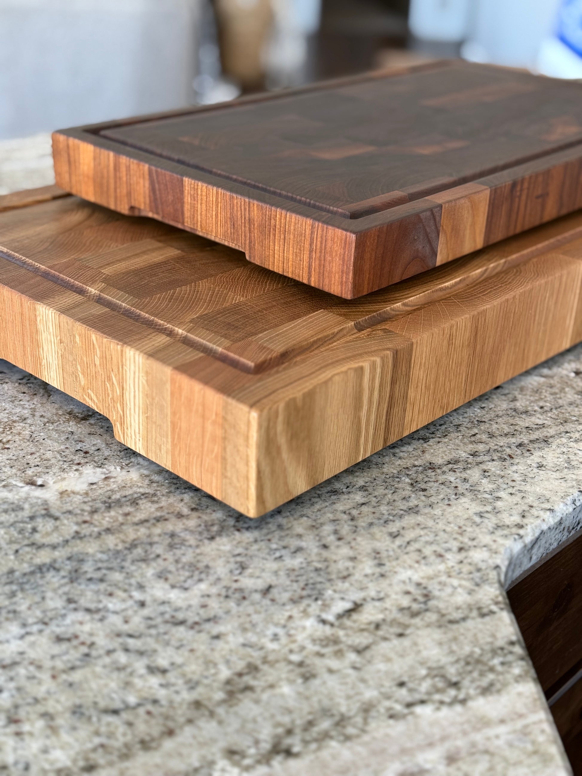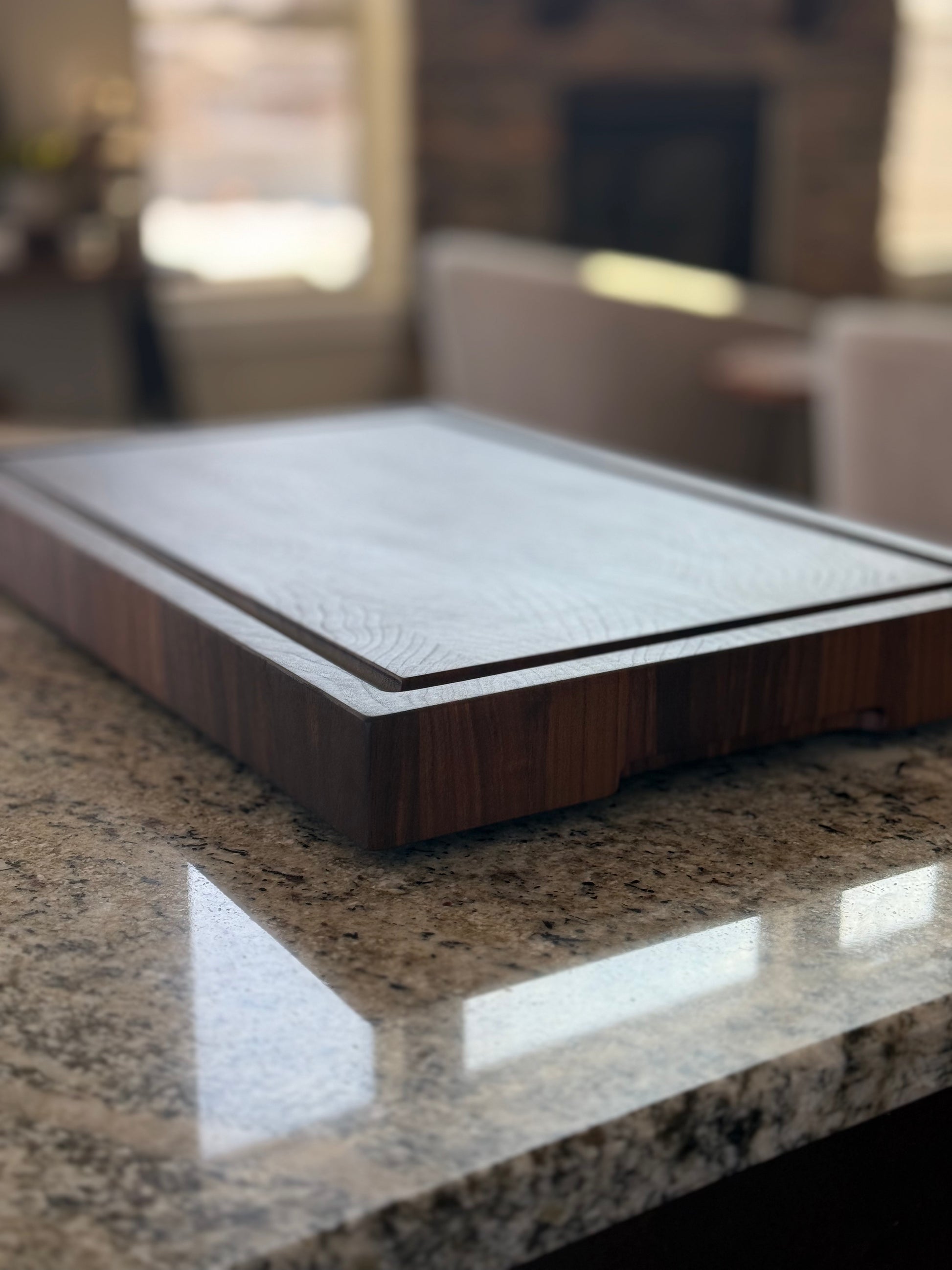This extra large cutting board is sure to make a statement in your kitchen! White oak or walnut end grain makes it durable, functional, keeps knives sharp and adds flair to any kitchen. It’s the last cutting board you’ll ever need with enough room to chop for a crowd. Easy to maintain, you’ll enjoy this for life!
