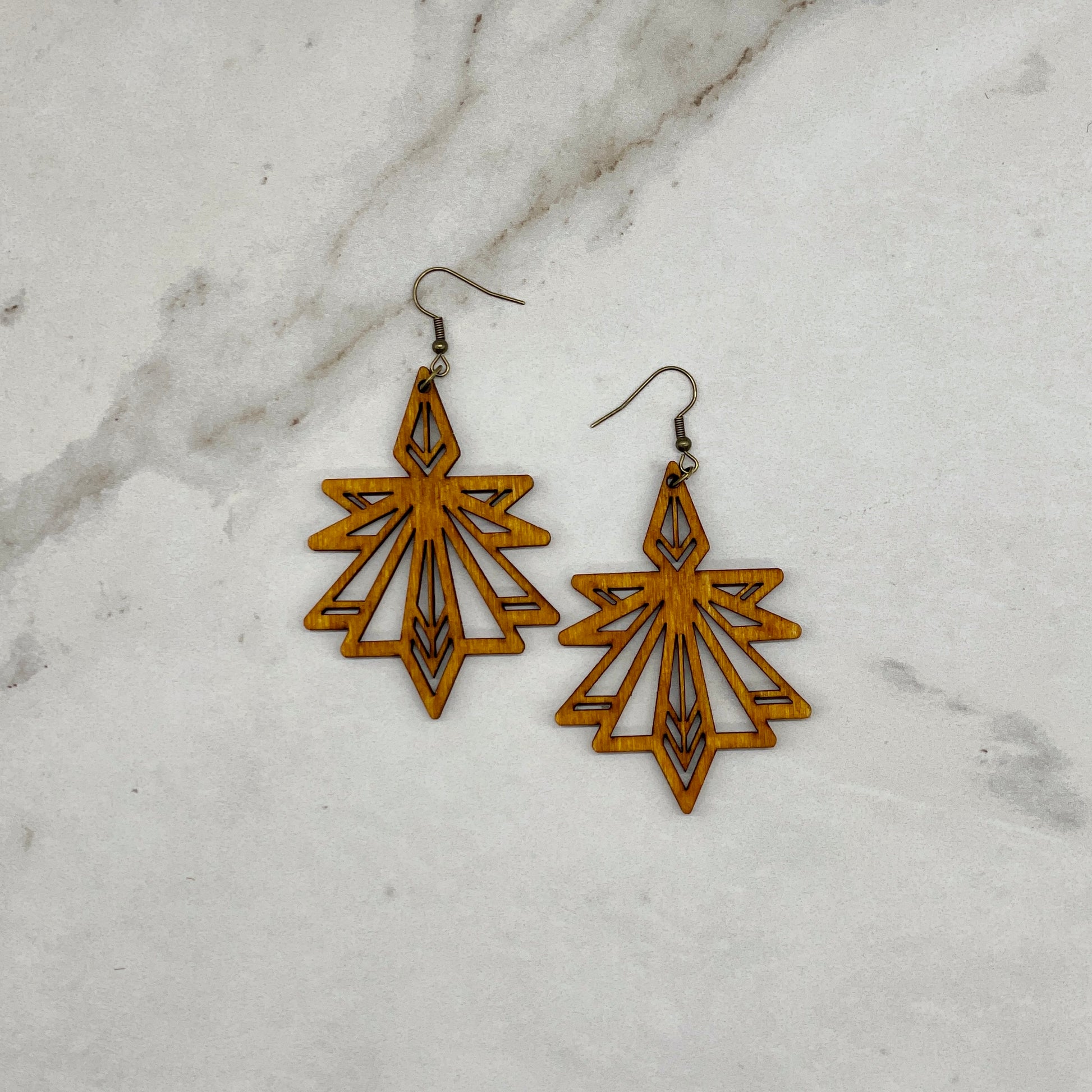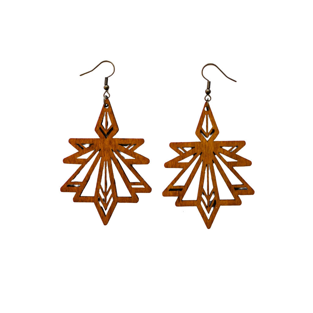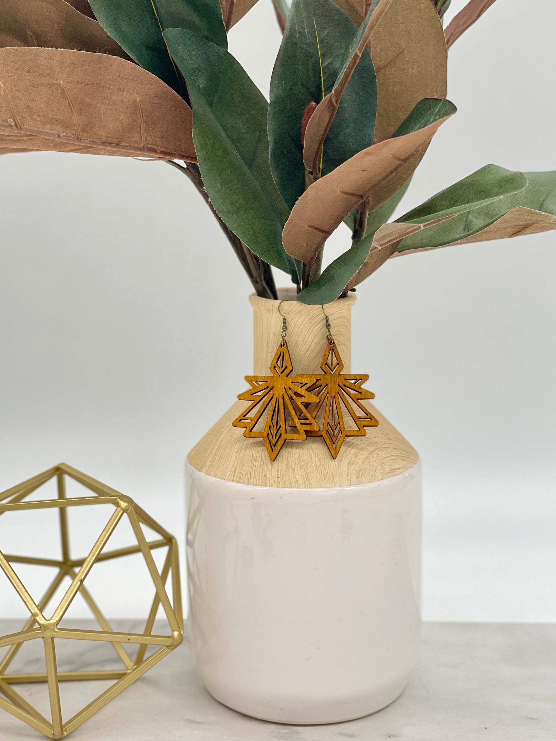 Taking inspiration from the beautiful architecture of the art deco era, these lightweight, wood earrings are sure to dress up any outfit. While the lines are simple and geometric, each one is a detailed, beautiful statement piece. These original designs are finished with an amber gold dye stain, and sealed with teak oil. Like all of our earrings, they are made with high quality, nickel free, hypoallergenic, components.. Measures 2 1/4x 1 3/4”.