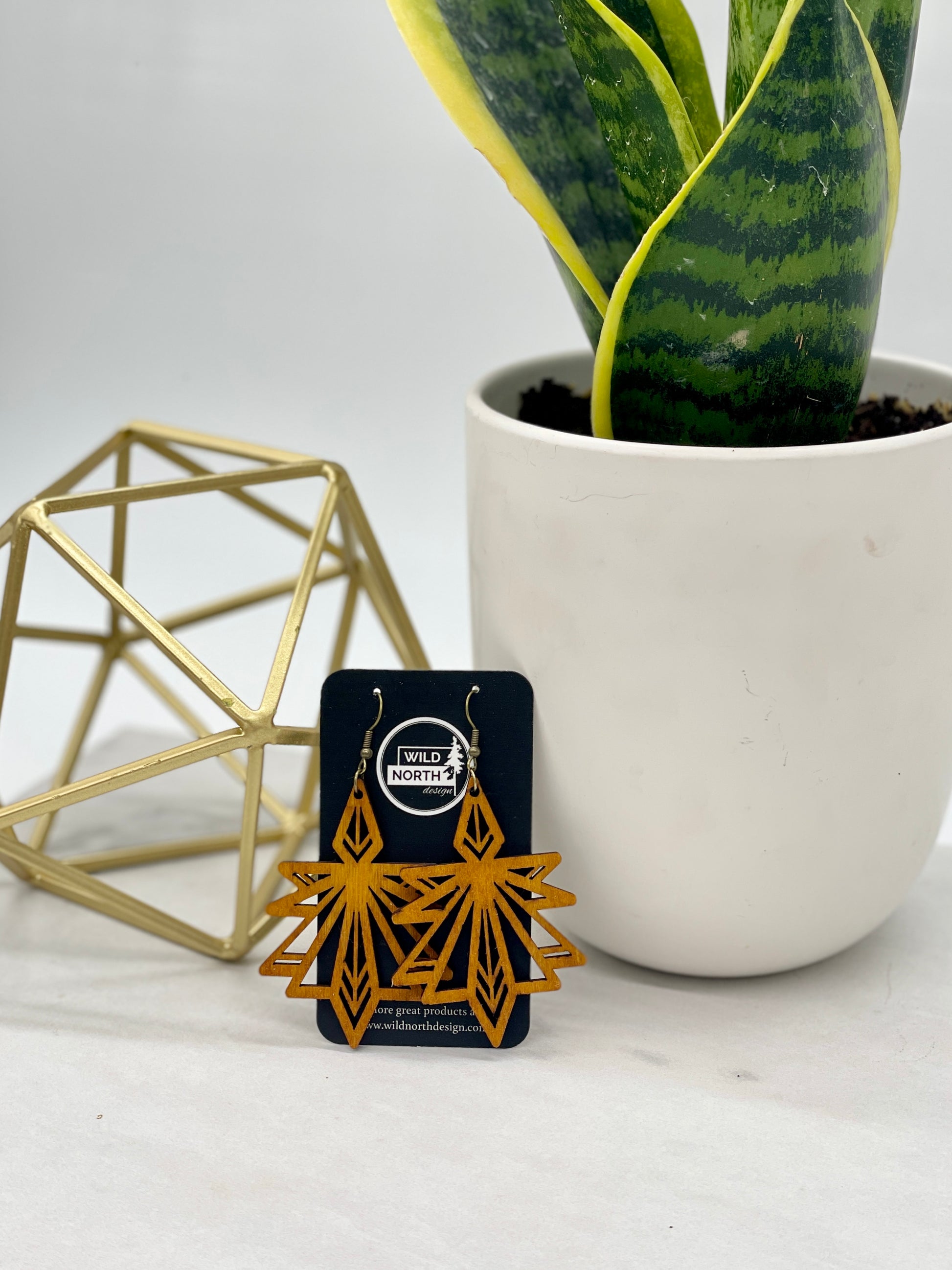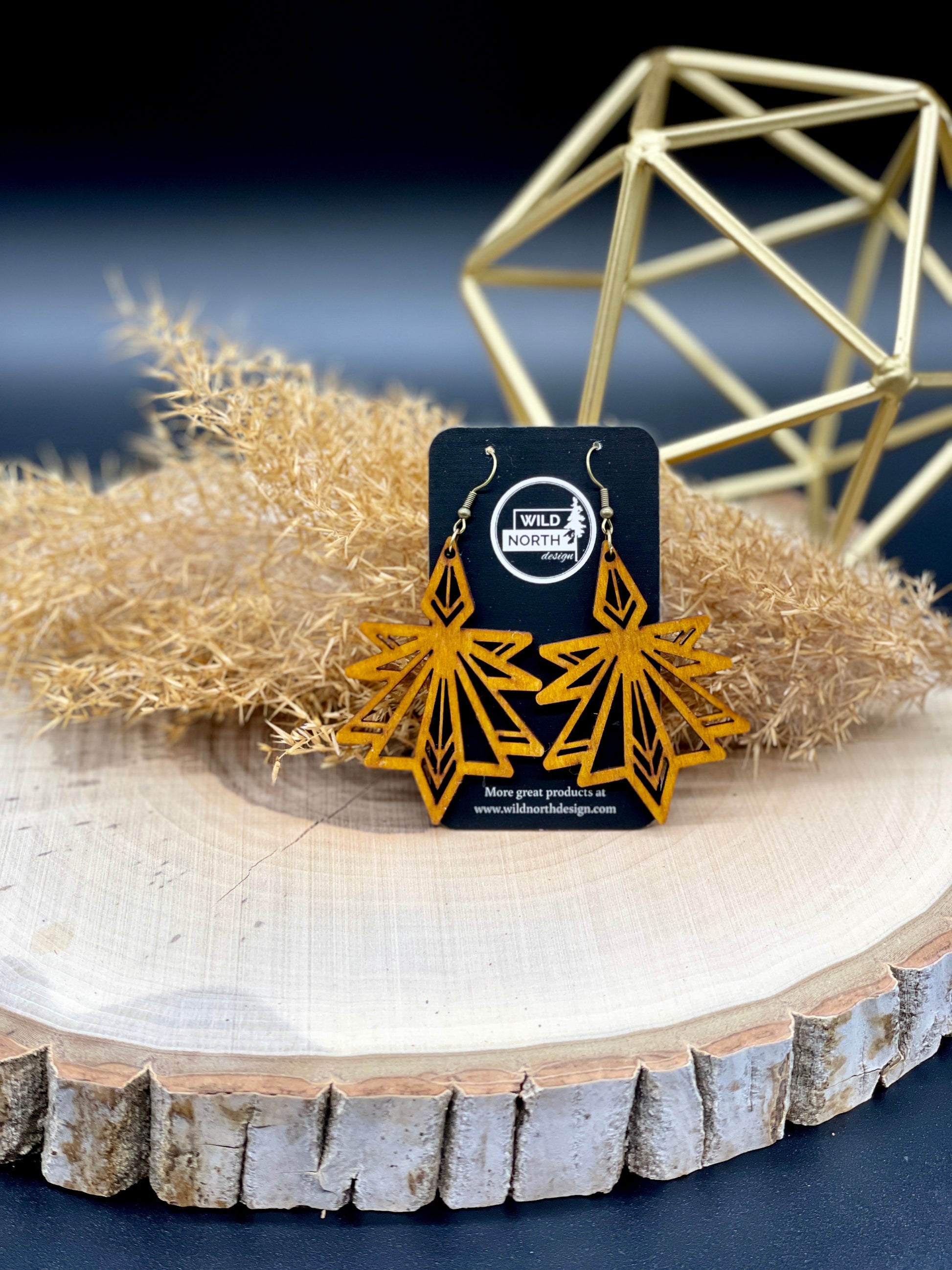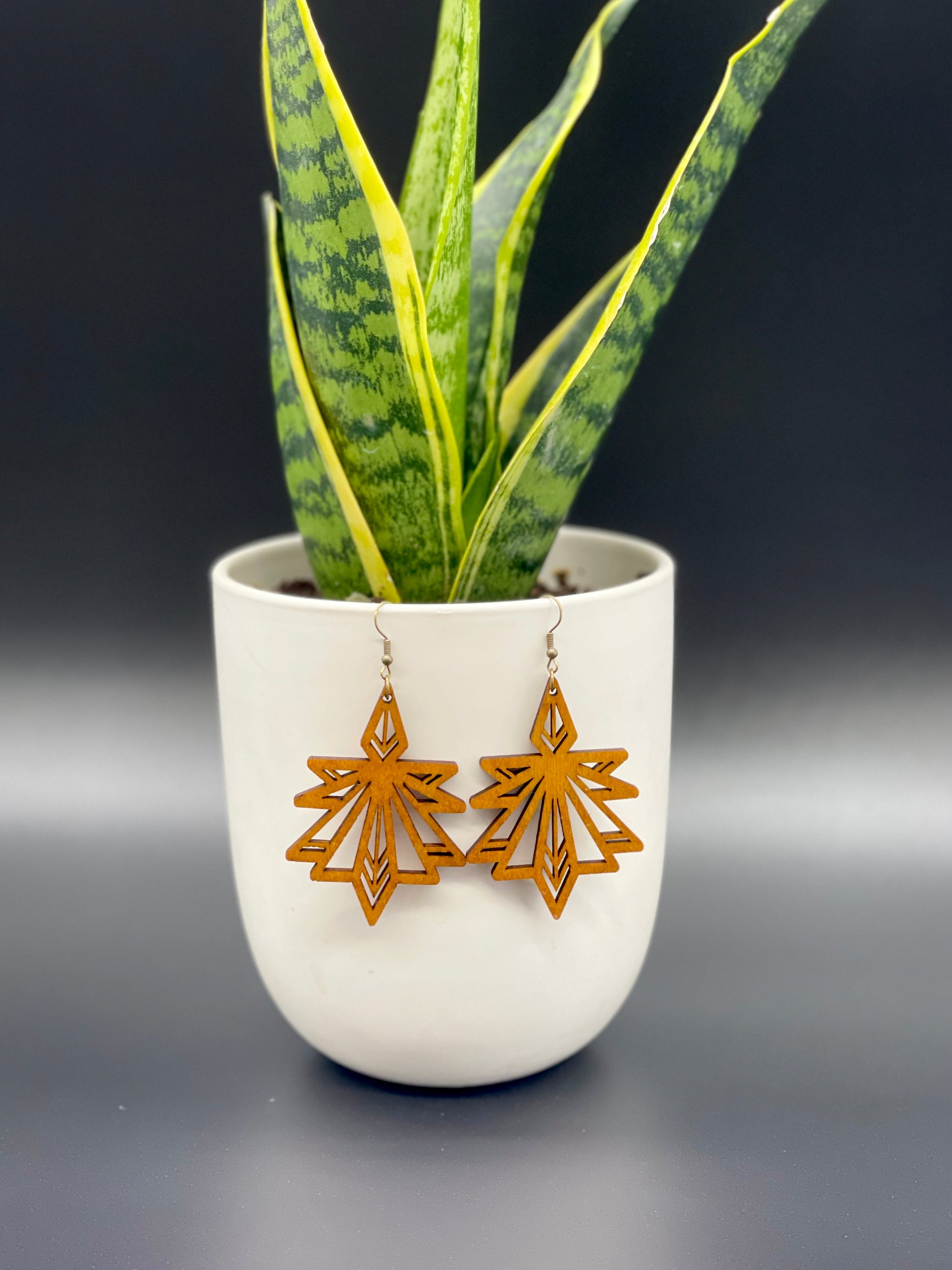 Taking inspiration from the beautiful architecture of the art deco era, these lightweight, wood earrings are sure to dress up any outfit. While the lines are simple and geometric, each one is a detailed, beautiful statement piece. These original designs are finished with an amber gold dye stain, and sealed with teak oil. Like all of our earrings, they are made with high quality, nickel free, hypoallergenic, components.. Measures 2 1/4x 1 3/4”.