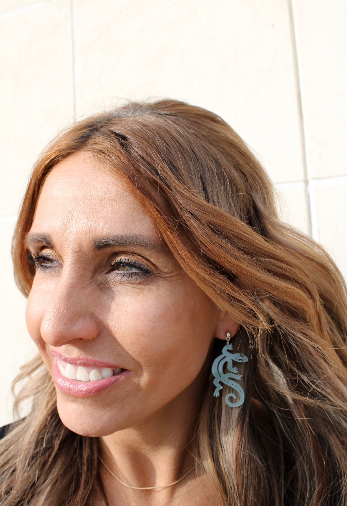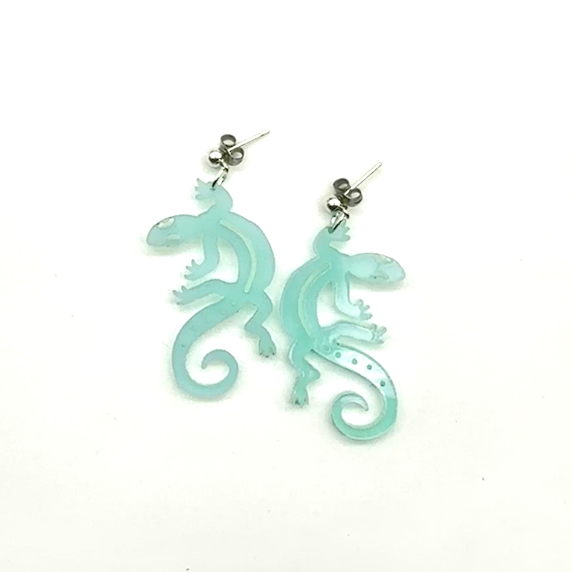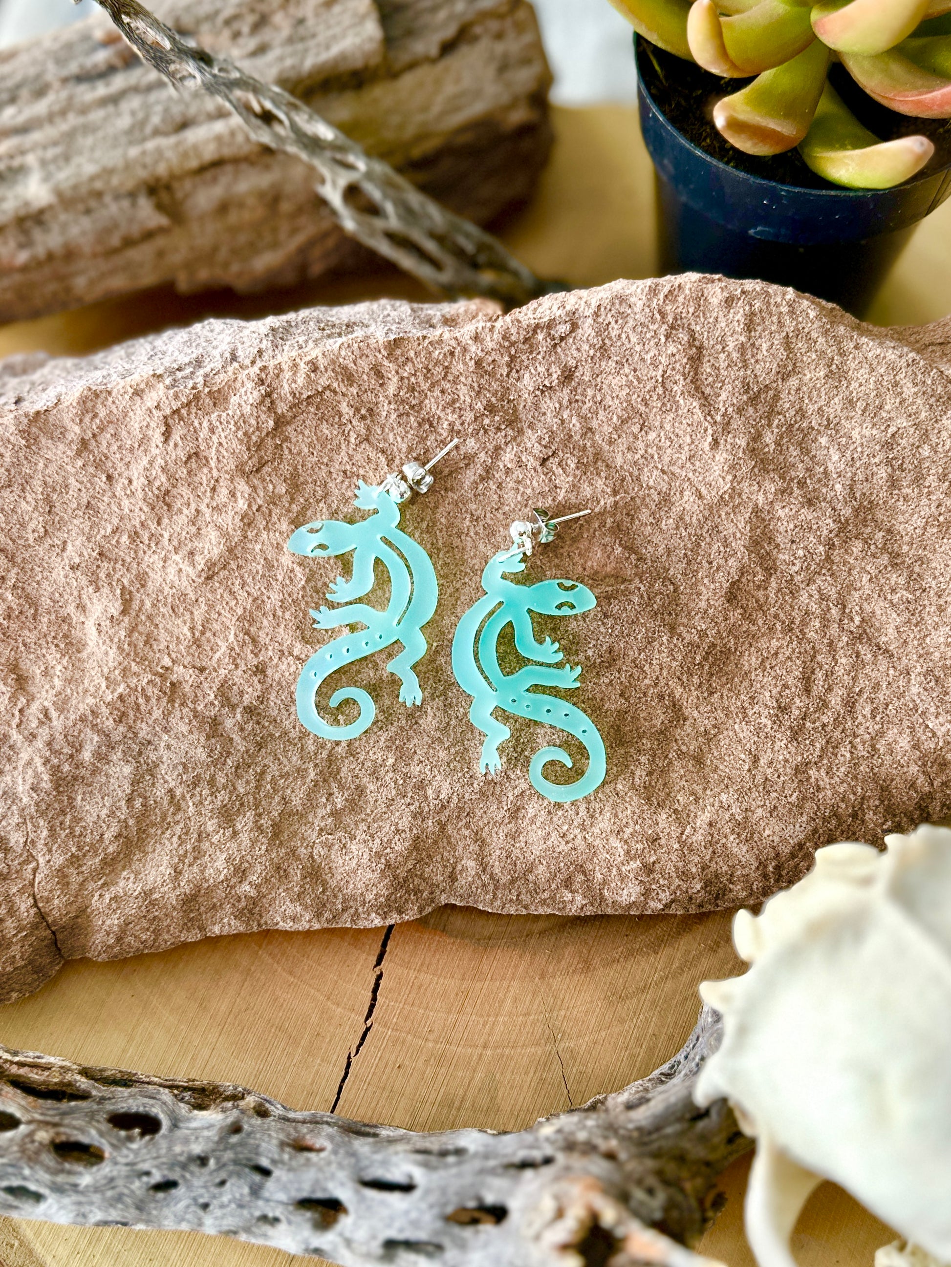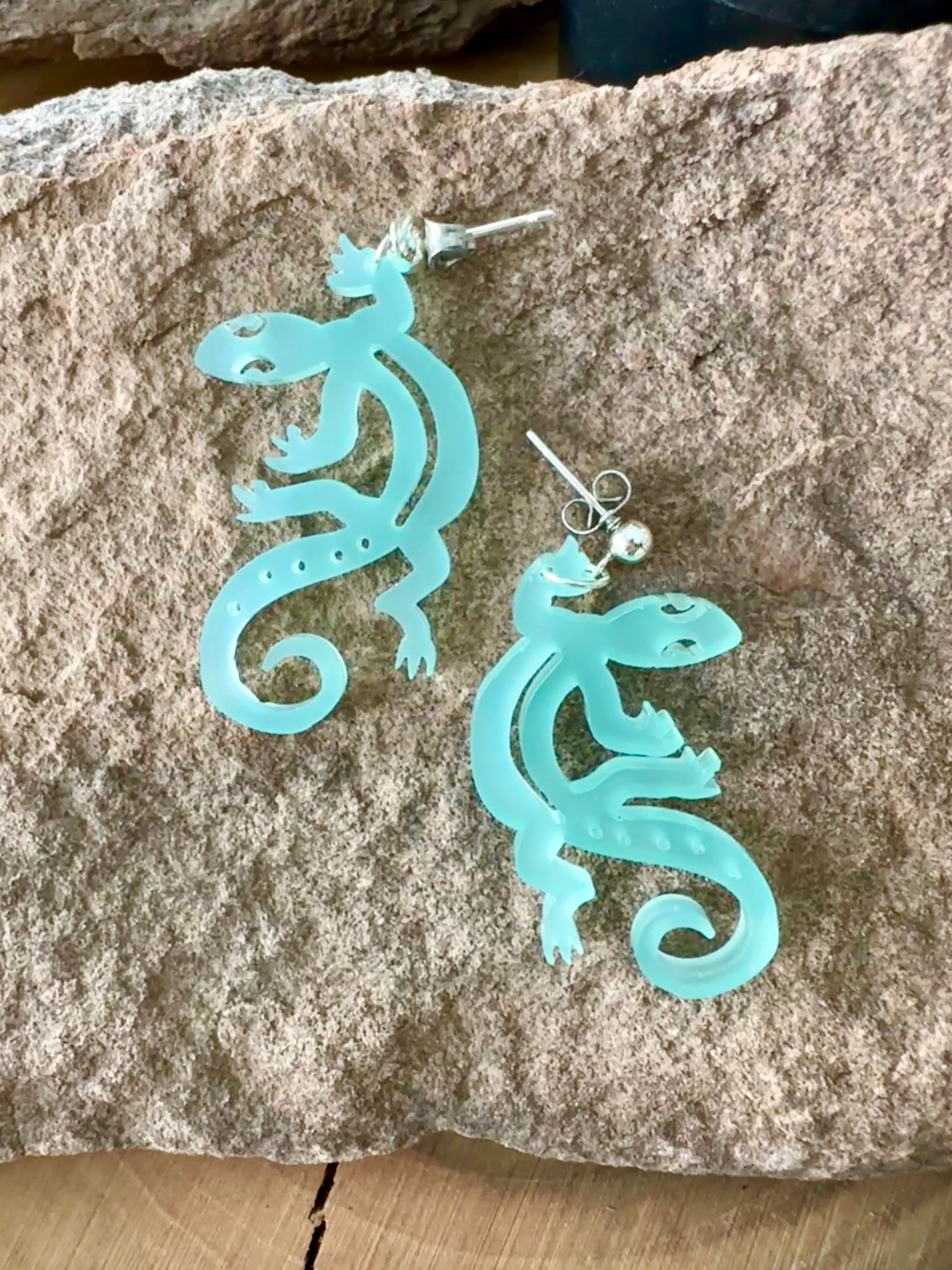 These cute lizard earrings are subtle yet so fun! These original designs are cut from translucent aquamarine acrylic. Like all of our earrings, they are made with high quality, nickel free, hypoallergenic, components.. Measures 1.75” x 1”.