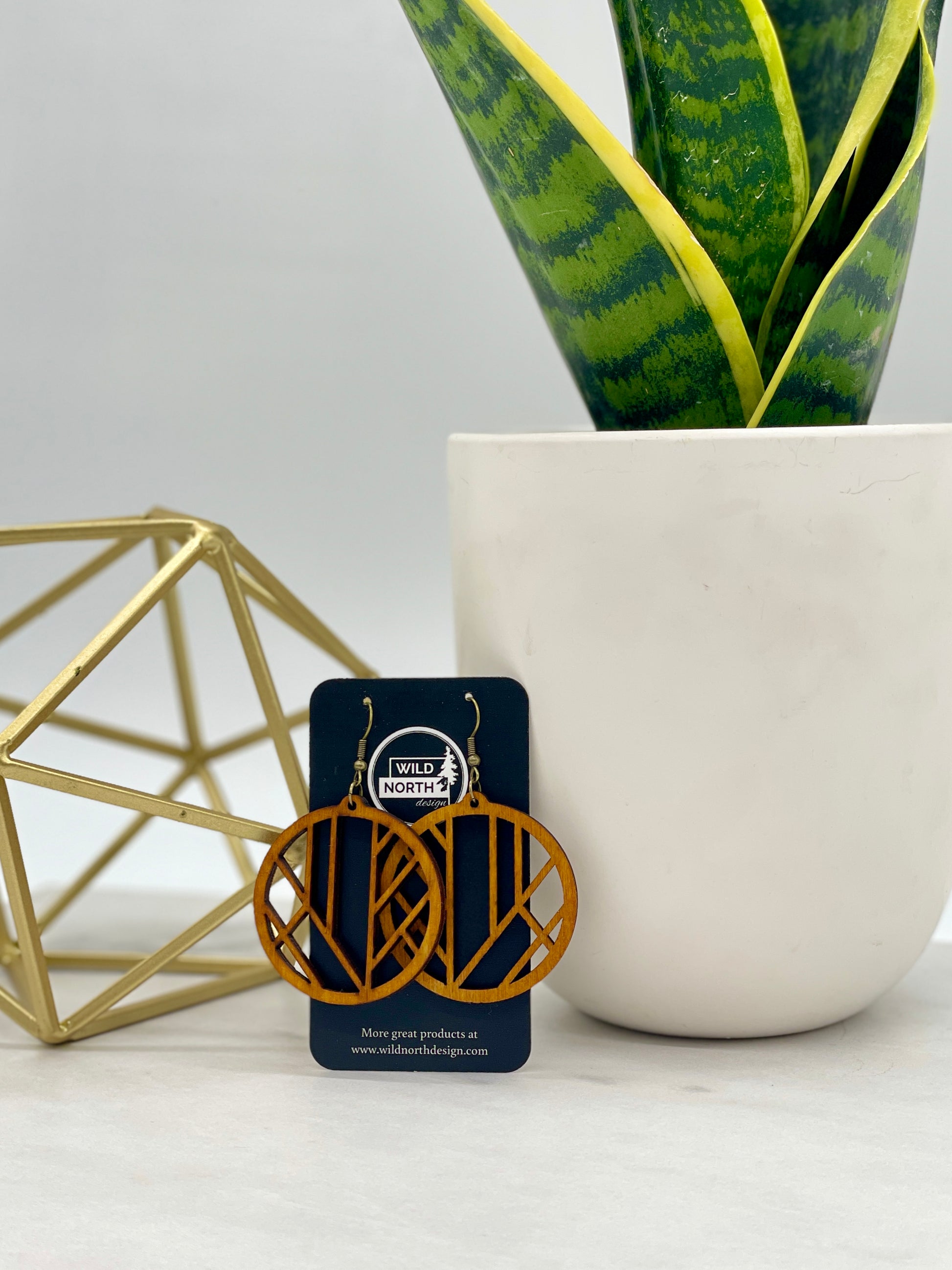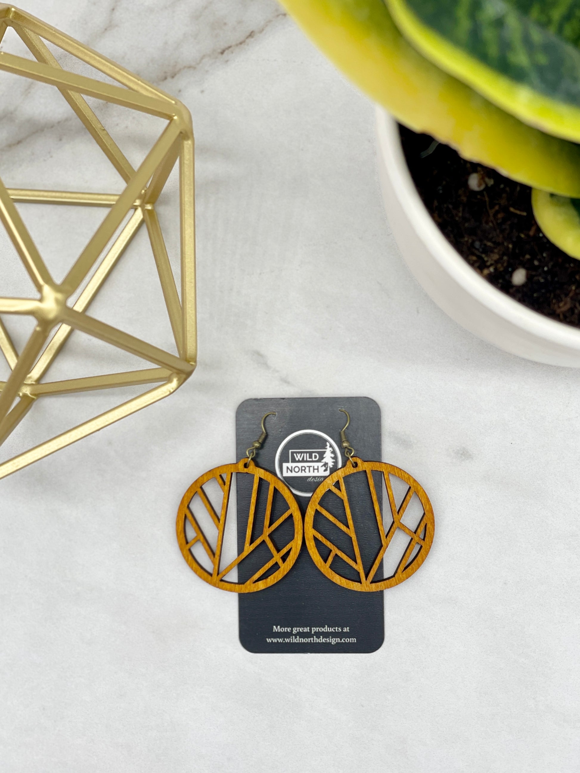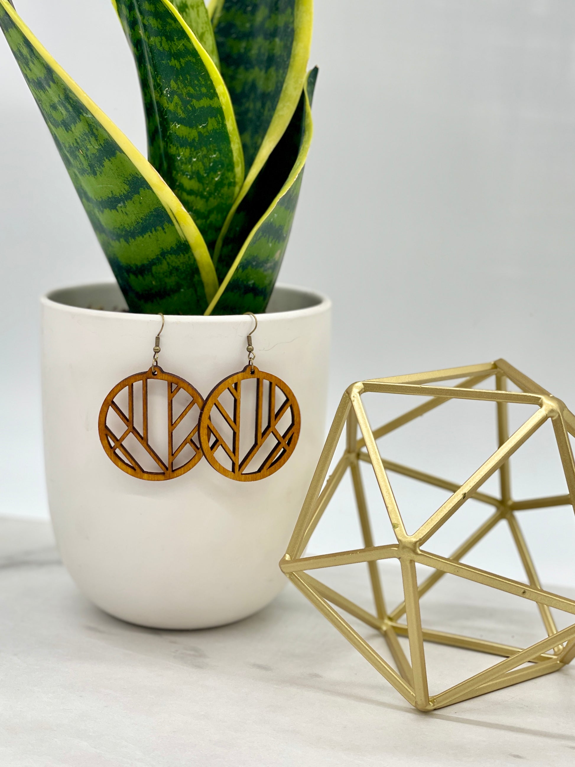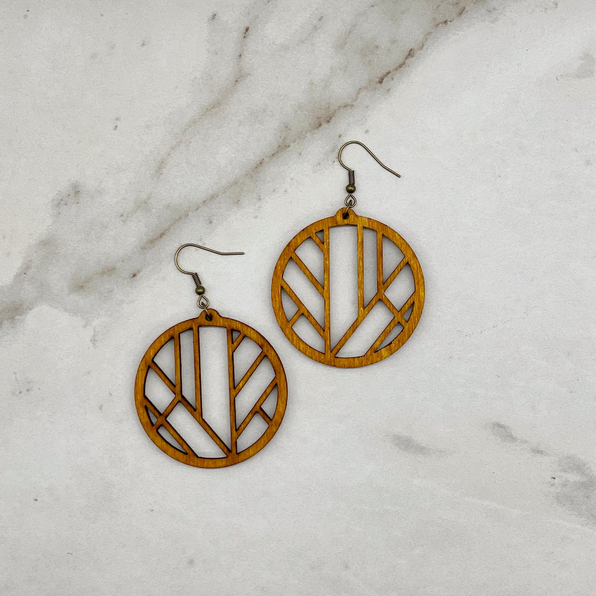 Taking inspiration from the beautiful architecture of the art deco era, these lightweight, wood earrings are sure to dress up any outfit. While the lines are simple and geometric, each one is a detailed, beautiful statement piece. These original designs are finished with an amber gold dye stain, and sealed with teak oil. Like all of our earrings, they are made with high quality, nickel free, hypoallergenic, components.. Measures 1 3/4 x 1 3/4”.