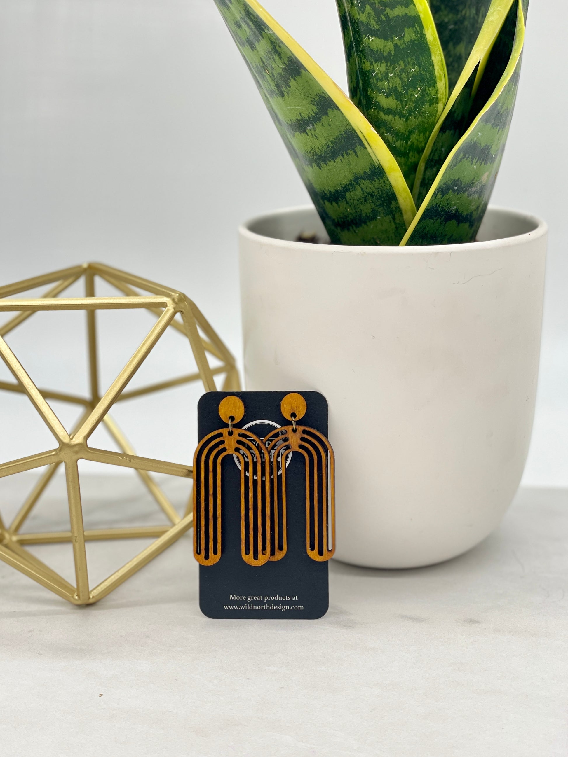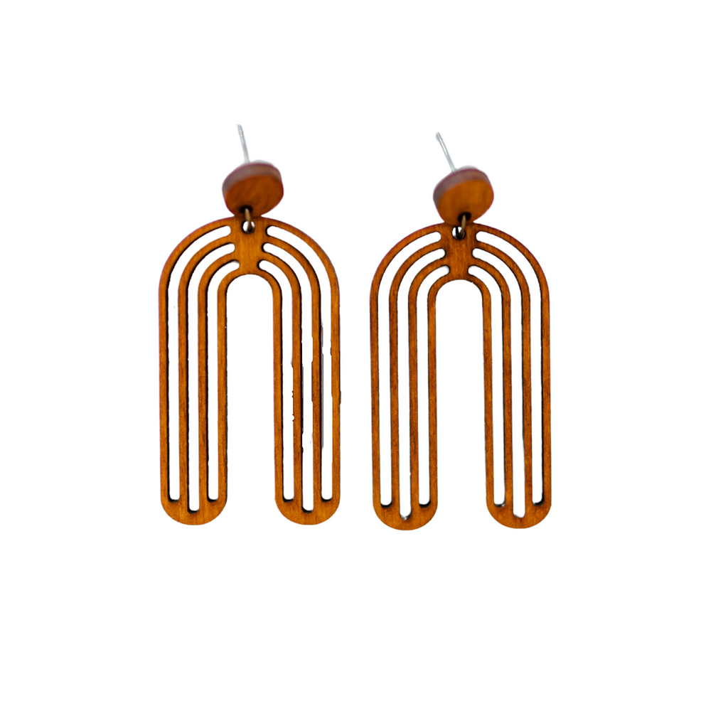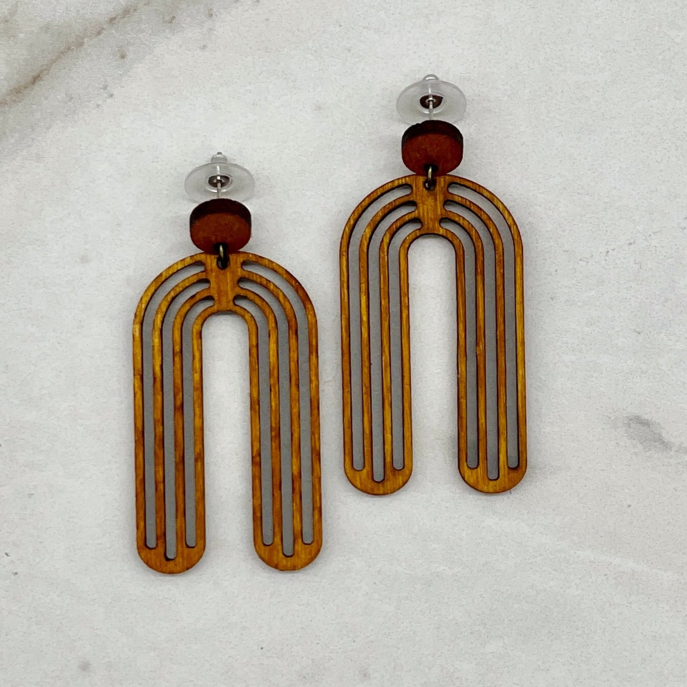 Taking inspiration from the beautiful architecture of the art deco era, these lightweight, wood earrings are sure to dress up any outfit. While the lines are simple and geometric, each one is a detailed, beautiful statement piece. These original designs are finished with an amber gold dye stain, and sealed with teak oil. Like all of our earrings, they are made with high quality, nickel free, hypoallergenic, components.. Measures 2 1/2x 1 1/4” including the stud.