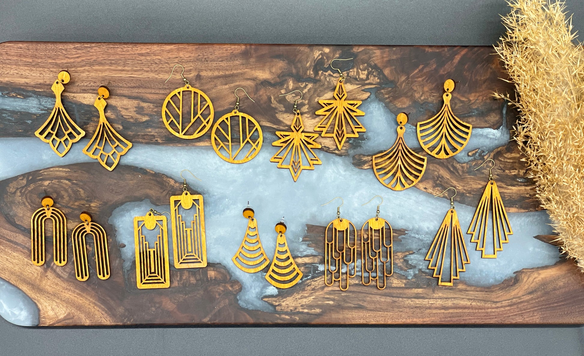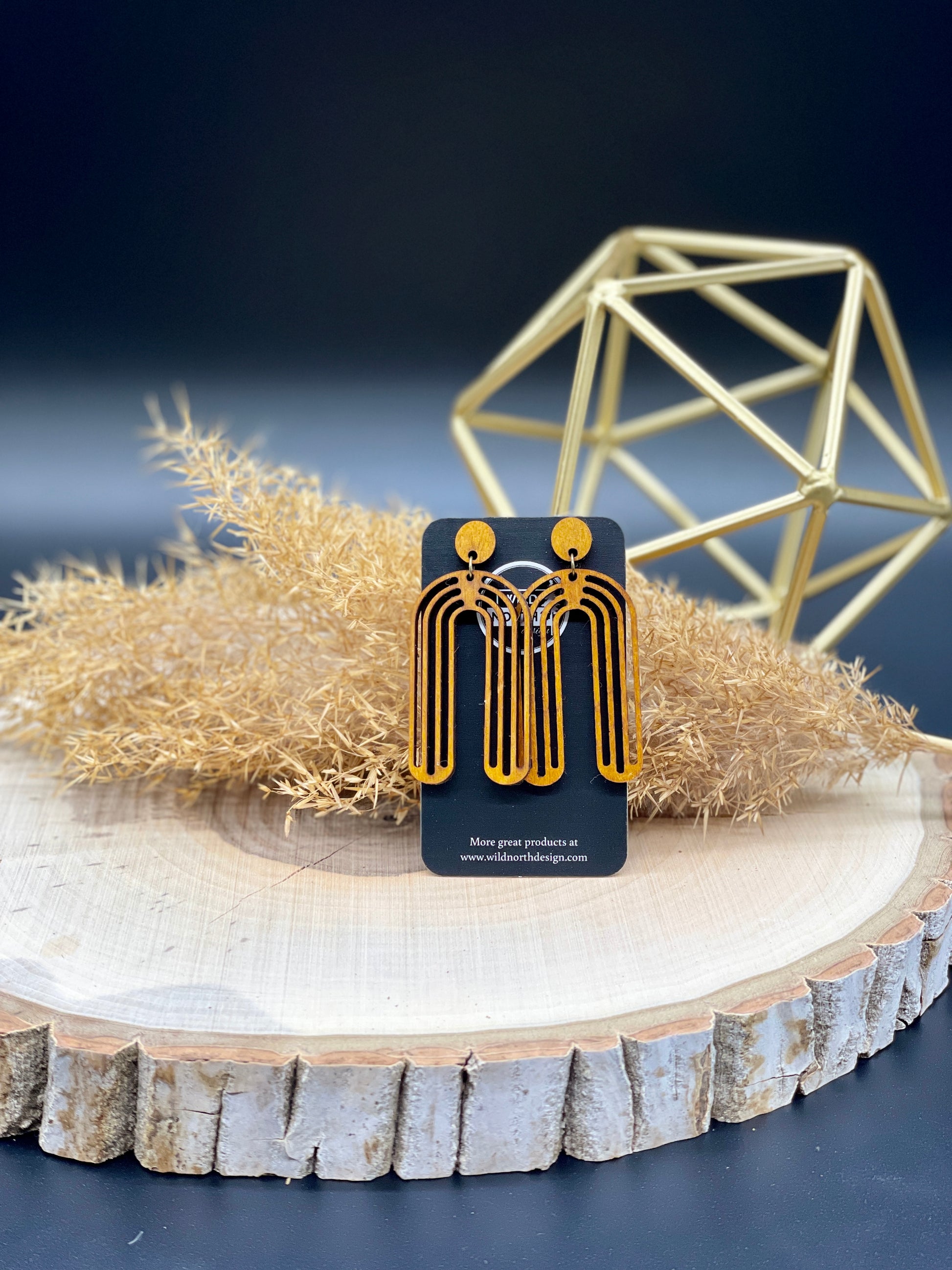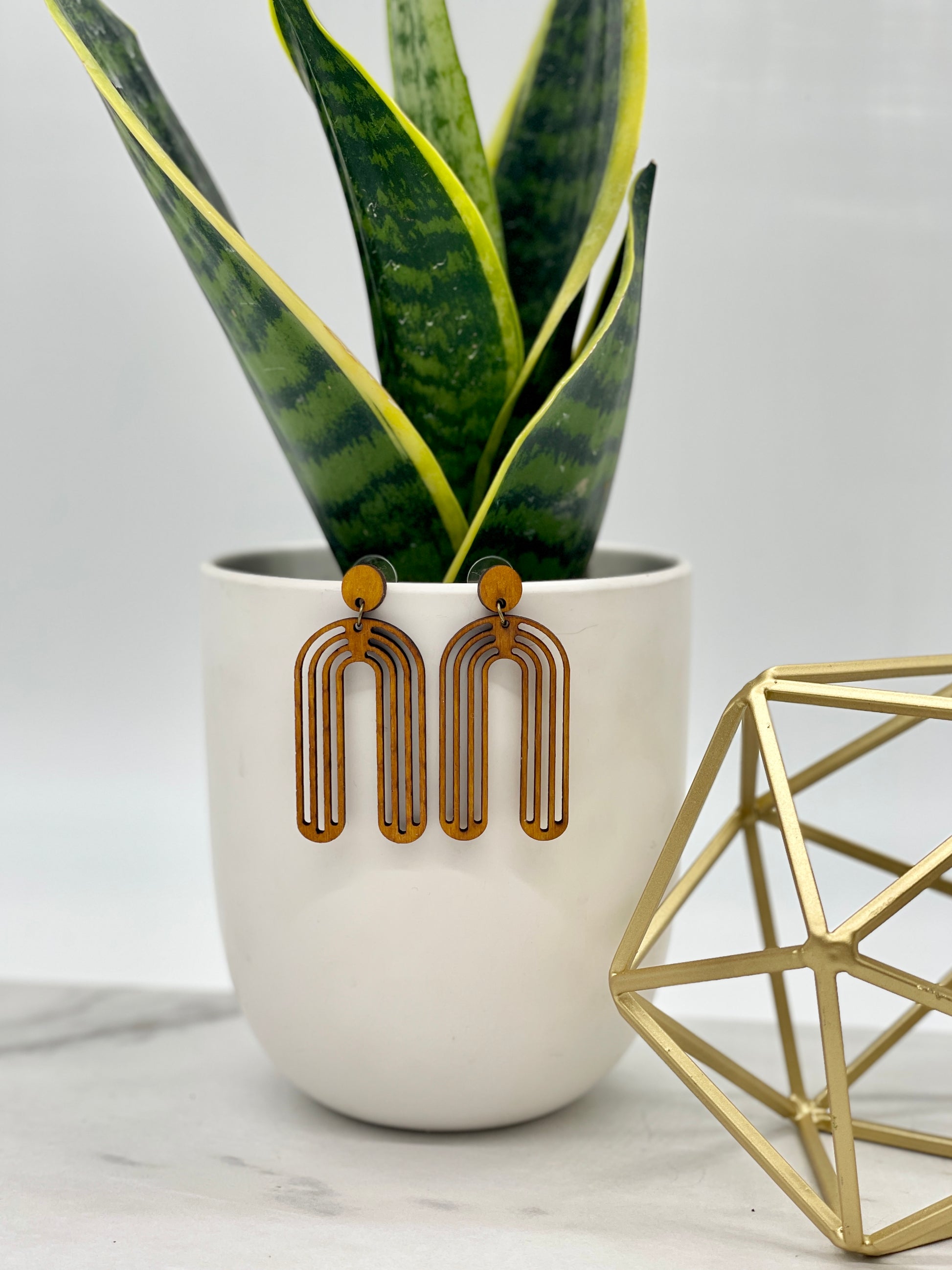Taking inspiration from the beautiful architecture of the art deco era, these lightweight, wood earrings are sure to dress up any outfit. While the lines are simple and geometric, each one is a detailed, beautiful statement piece. These original designs are finished with an amber gold dye stain, and sealed with teak oil. Like all of our earrings, they are made with high quality, nickel free, hypoallergenic, components.. Measures 2 1/2x 1 1/4” including the stud.