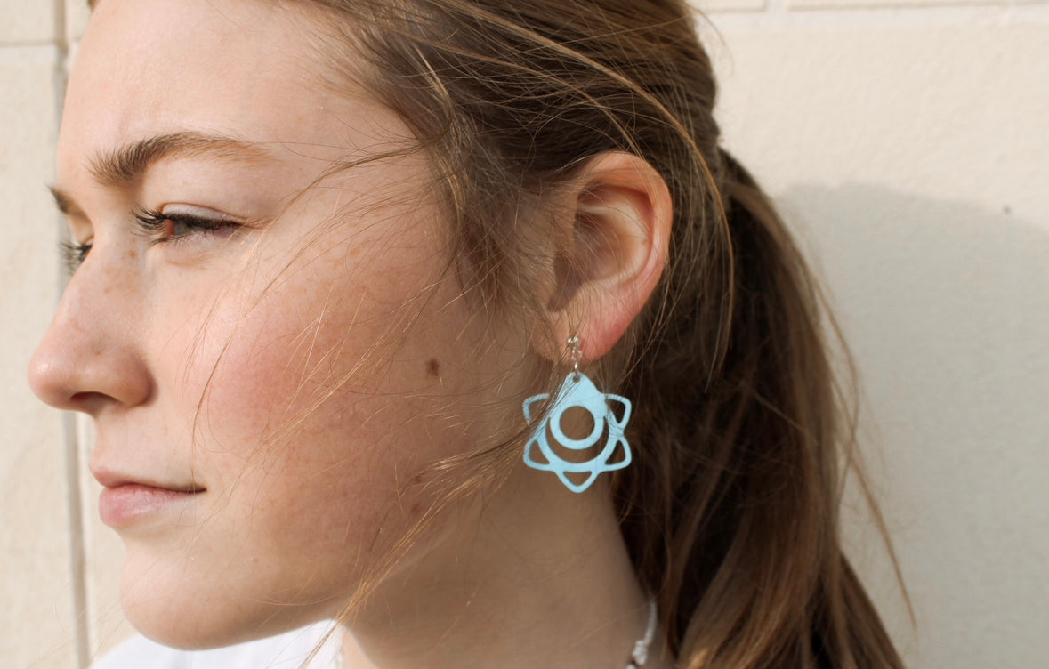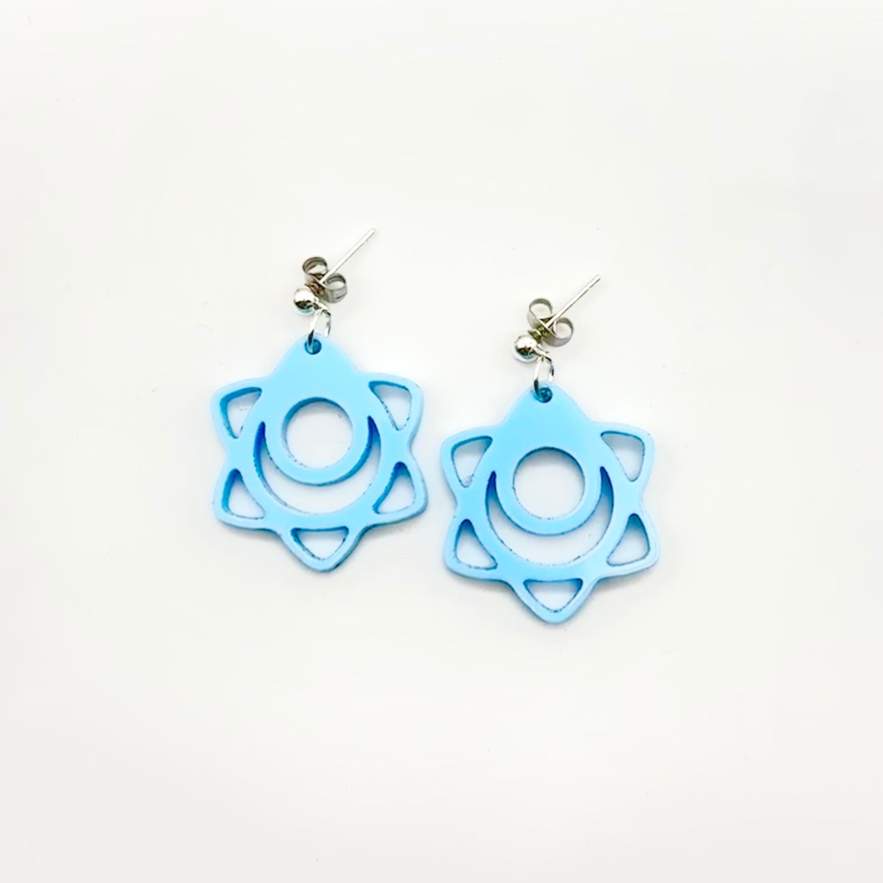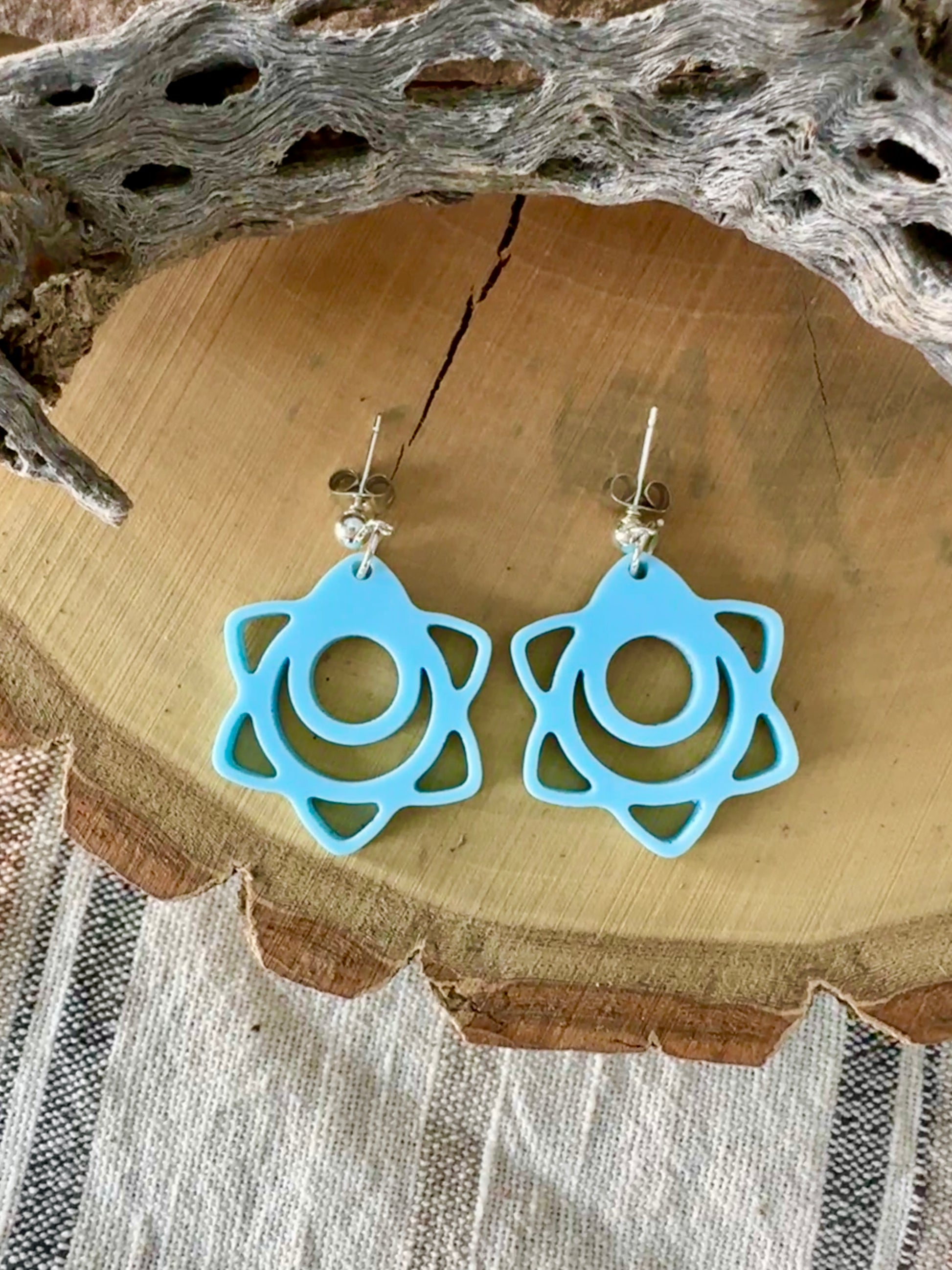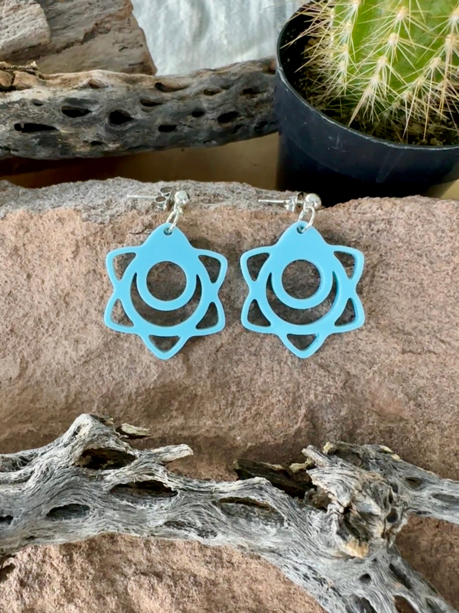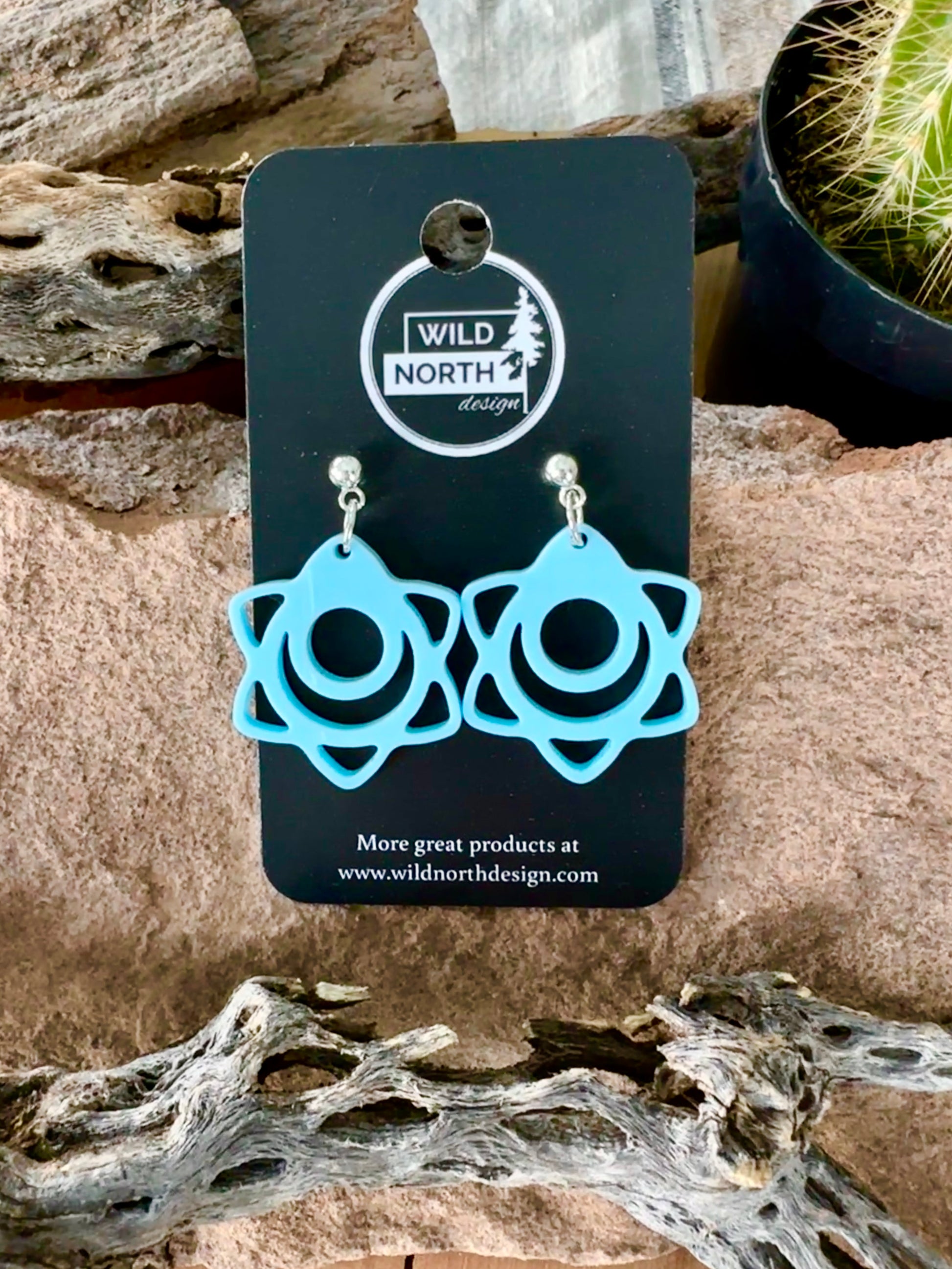 Just like an oasis in the desert, these earring give off a calming vibe. An original design, they are cut from sky blue acrylic. Like all of our earrings, they are made with high quality, nickel free, hypoallergenic, components.. Measures 1.25” x 1”.
