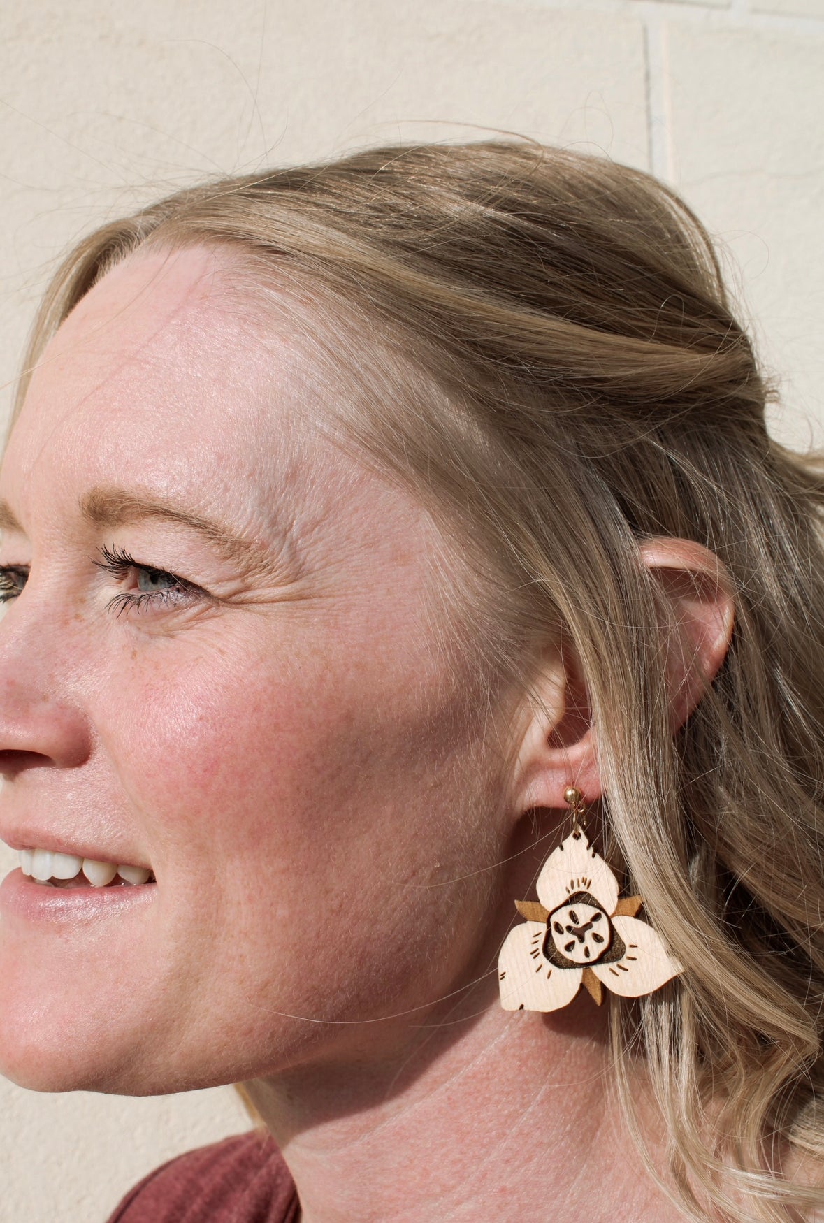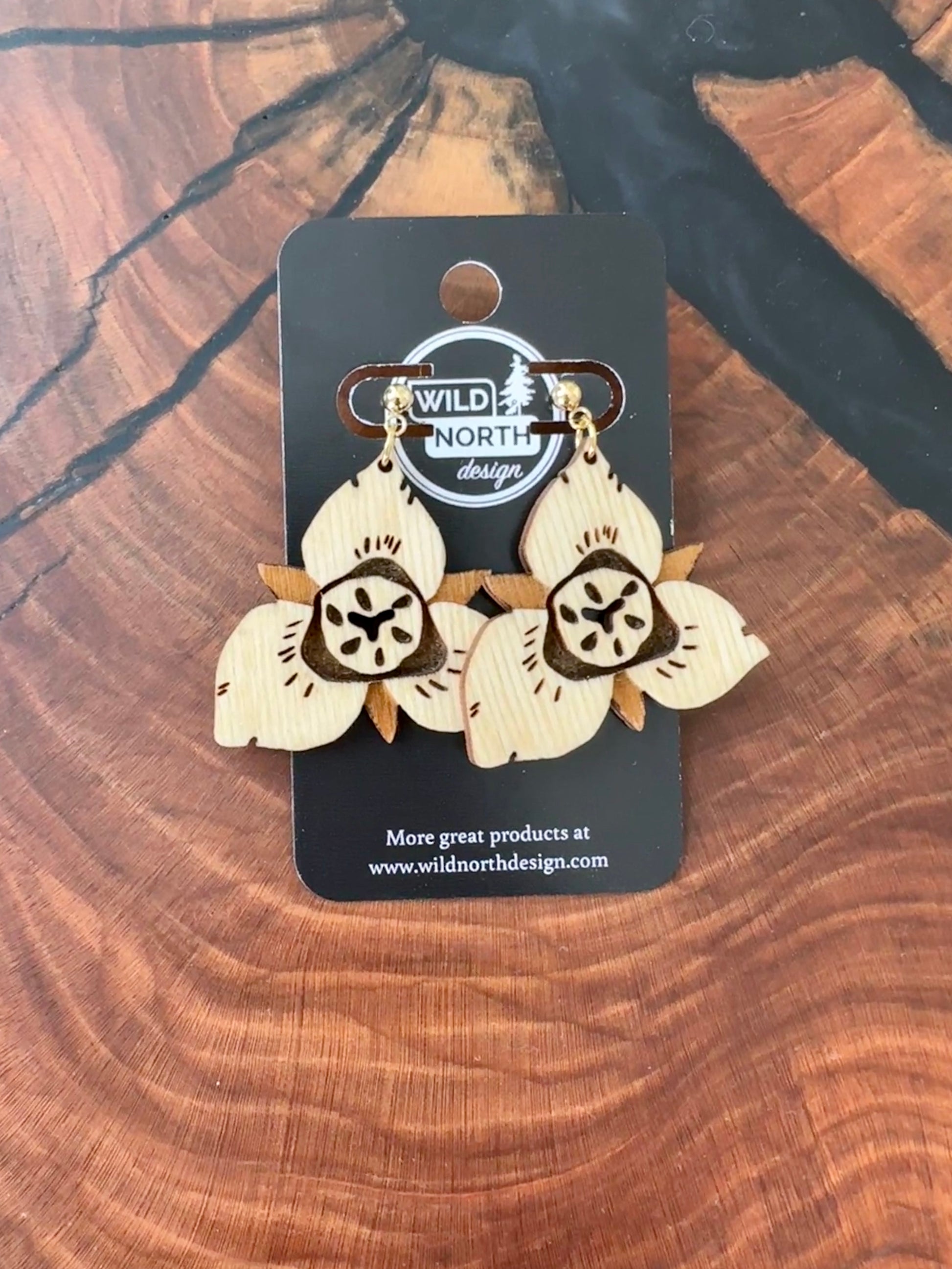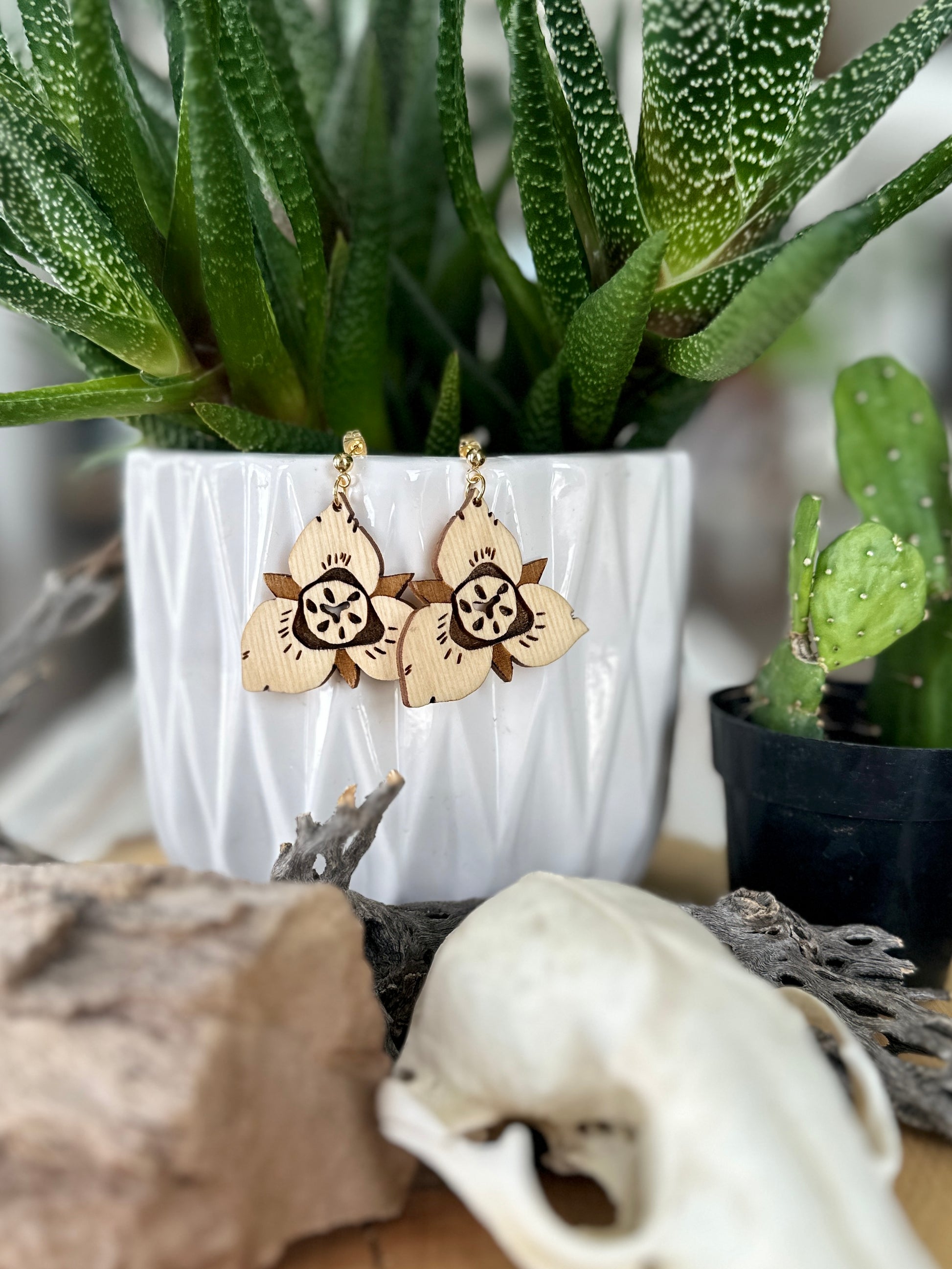 These original Sego Lily earrings will have you dreaming of the desert. These original designs are cut and etched from Baltic birch and sealed with teak oil. Like all of our earrings, they are made with high quality, nickel free, hypoallergenic, components.. Measures 1.5” x 1.5”.
