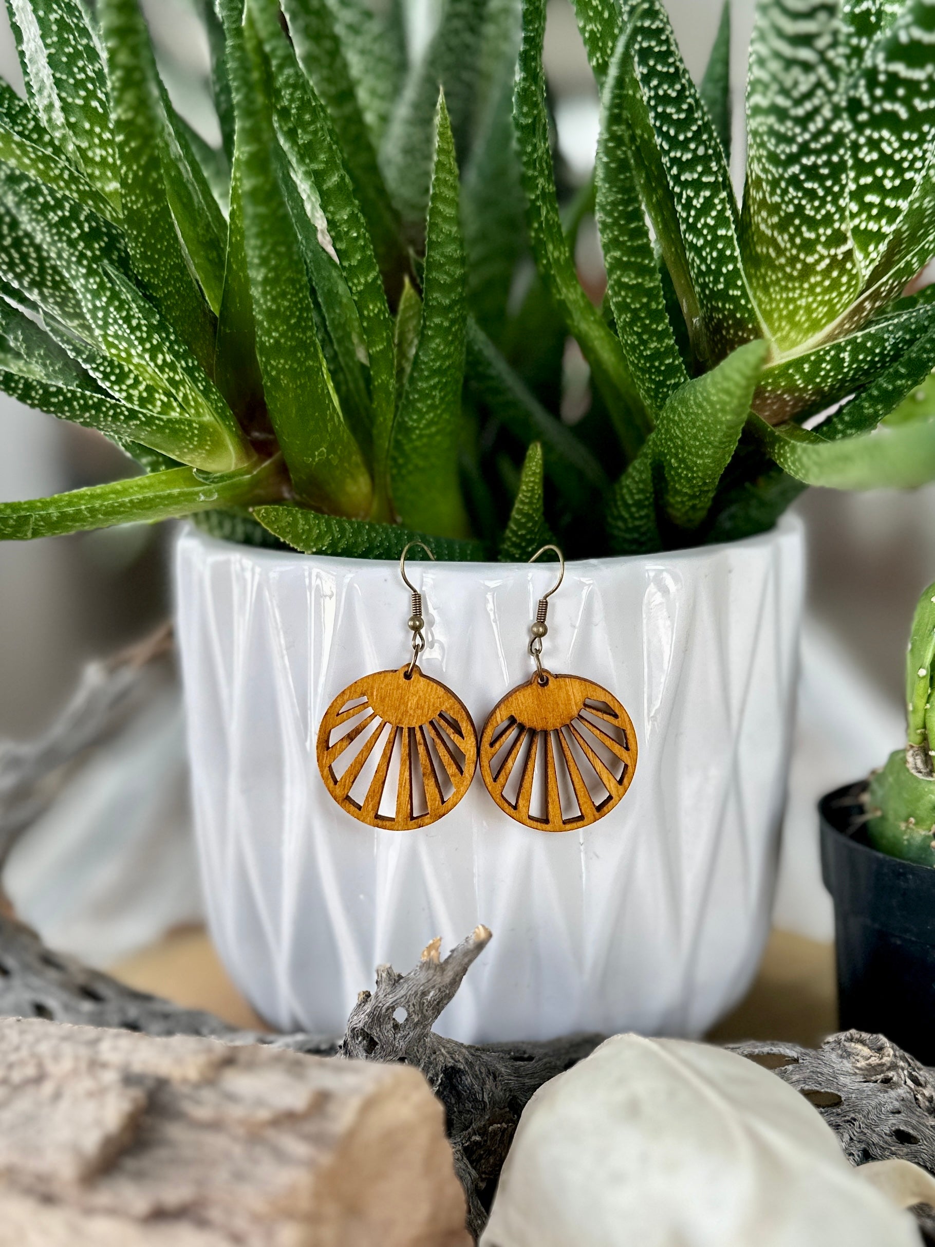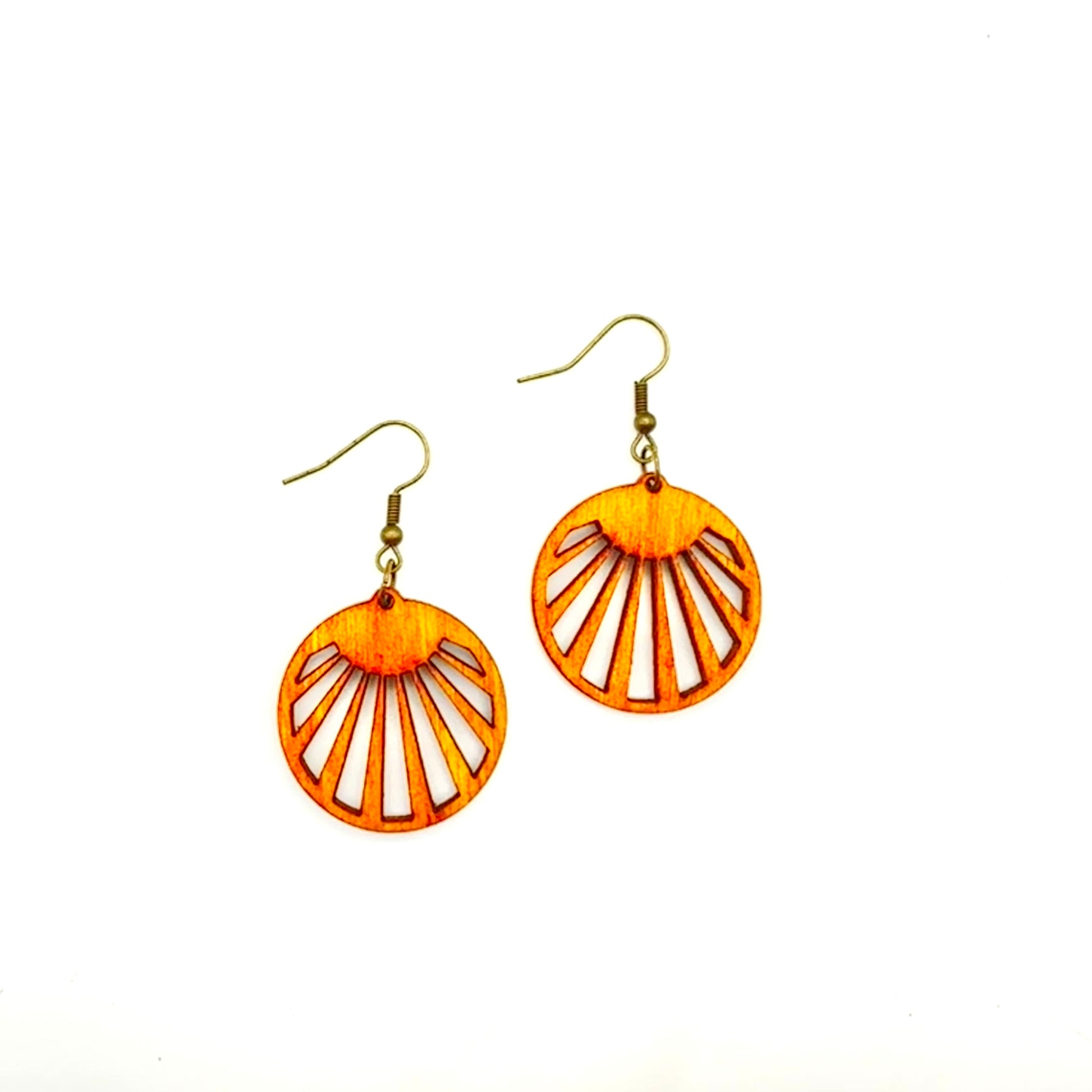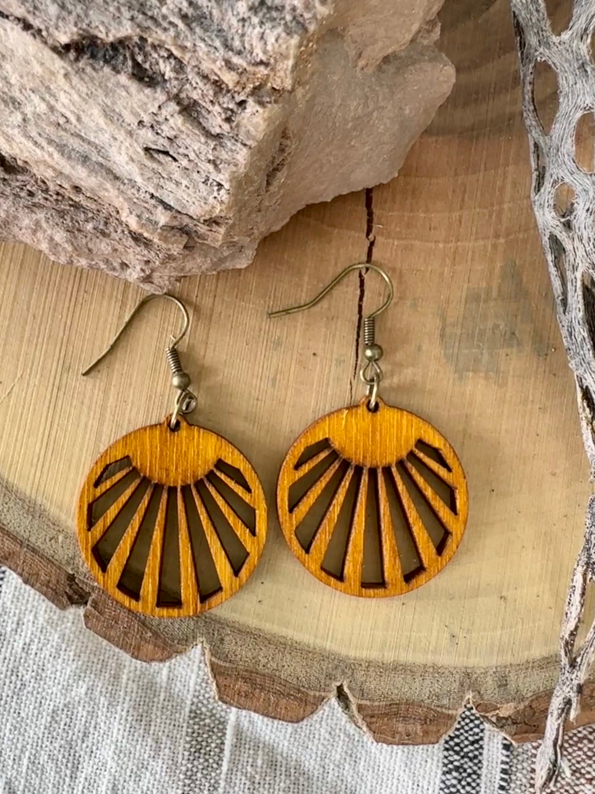 These Sunshine earrings will have you dreaming of the desert. These original designs are cut from Baltic birch, stained with an amber gold dye, and sealed with teak oil. Like all of our earrings, they are made with high quality, nickel free, hypoallergenic, components.. Measures 1.25” x 1.25”.