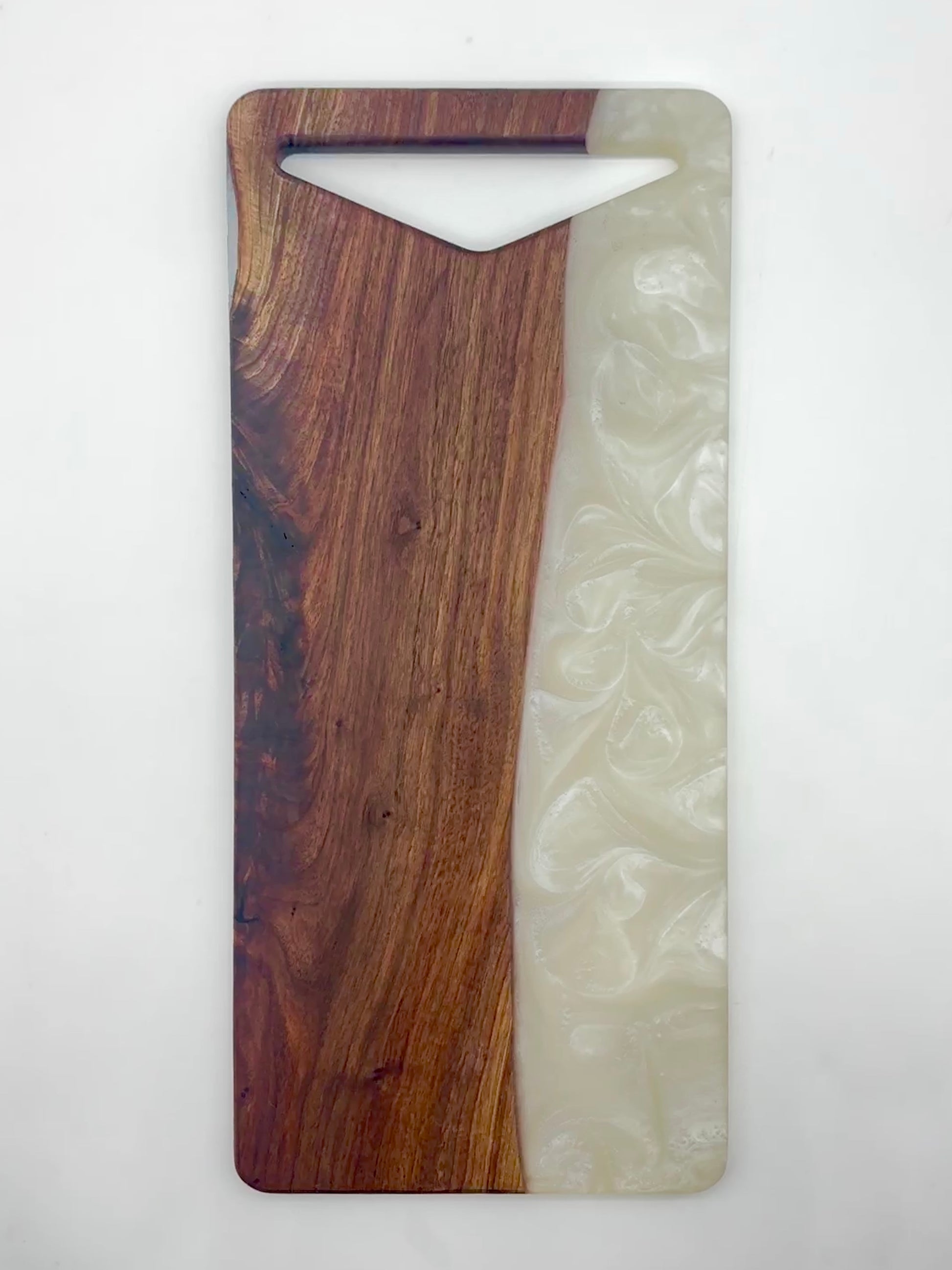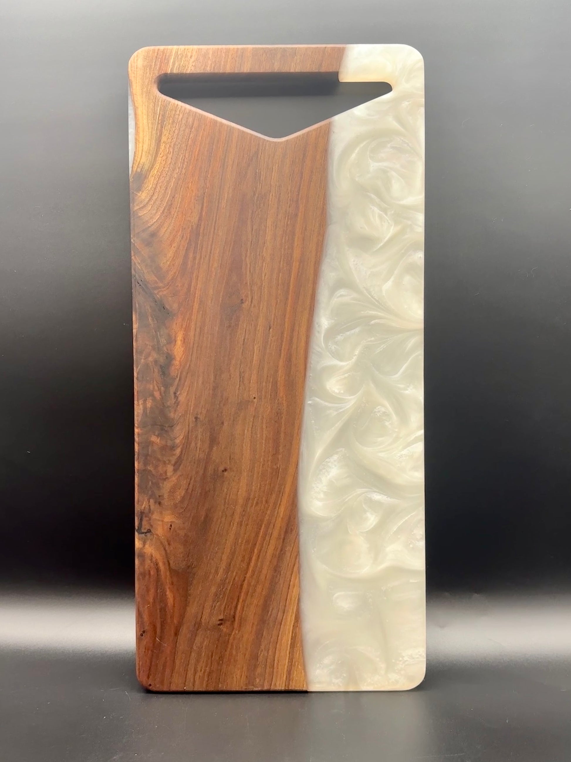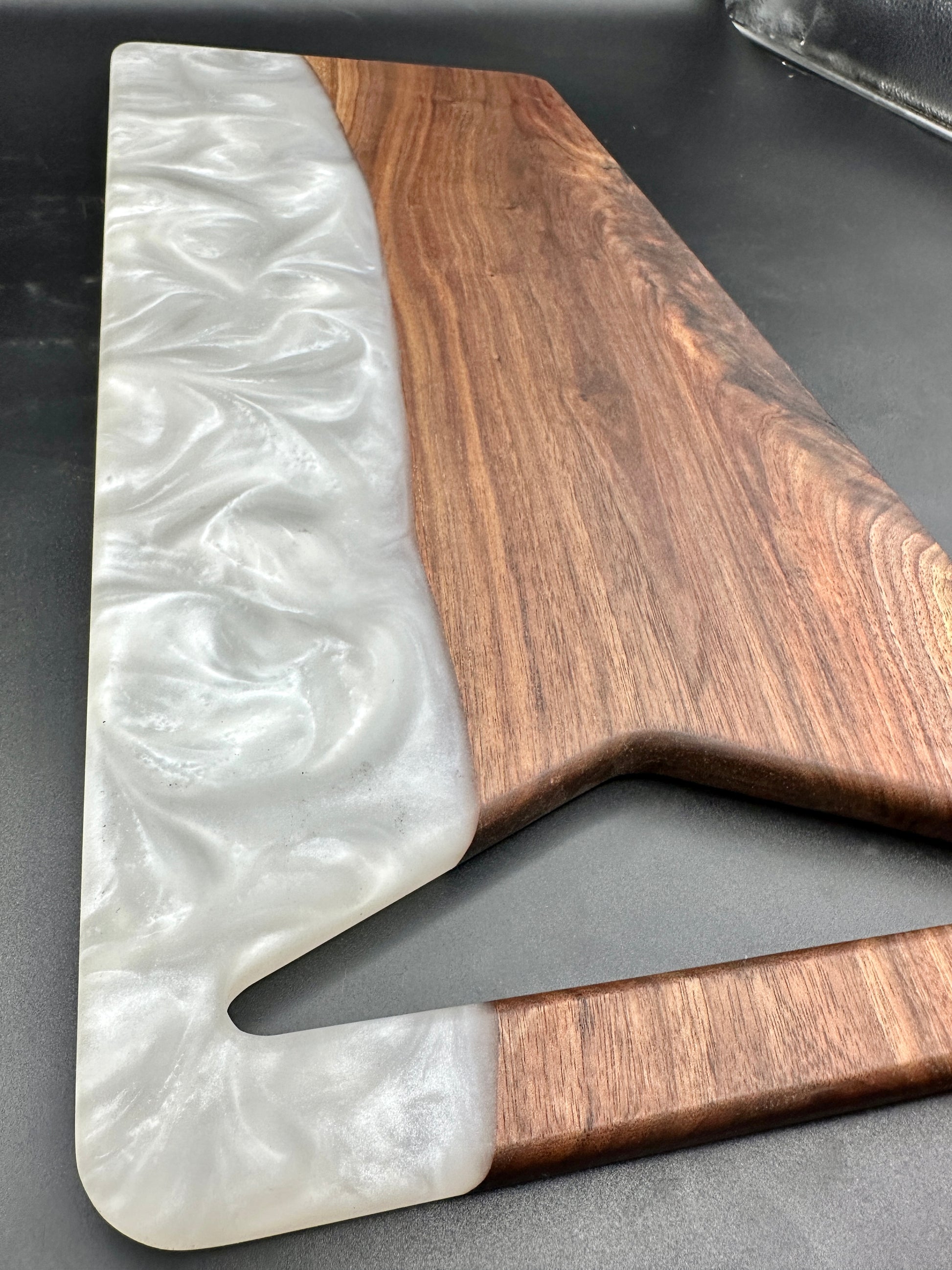 Walnut and pearl white resin board with triangle cut out handle. Perfect for serving appetizers, cheese or charcuterie.