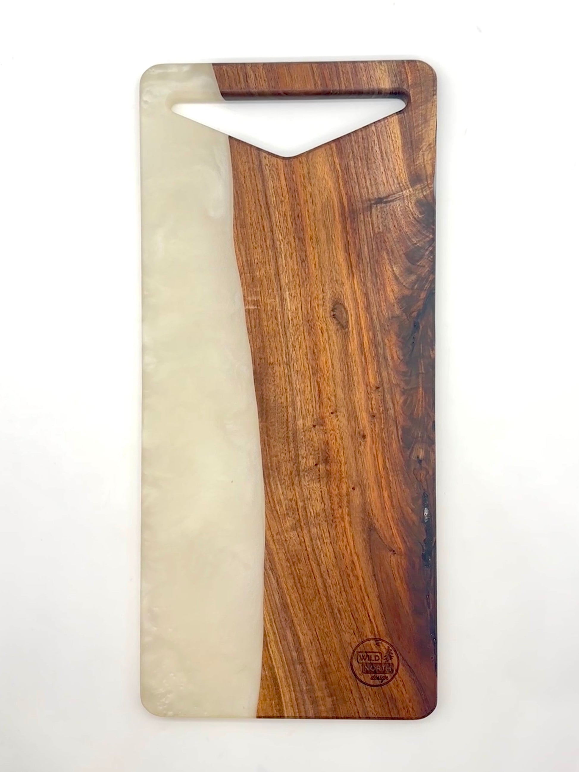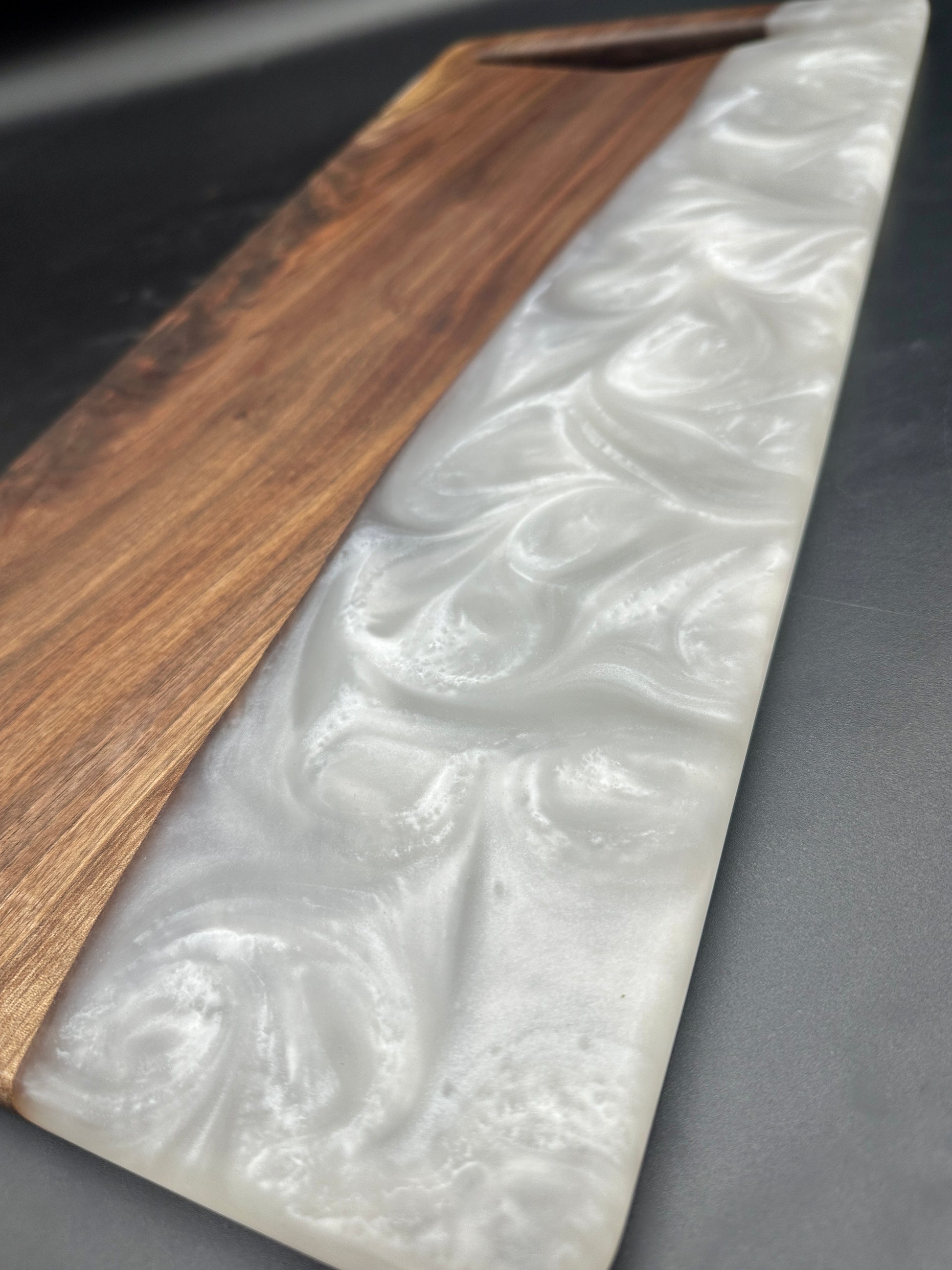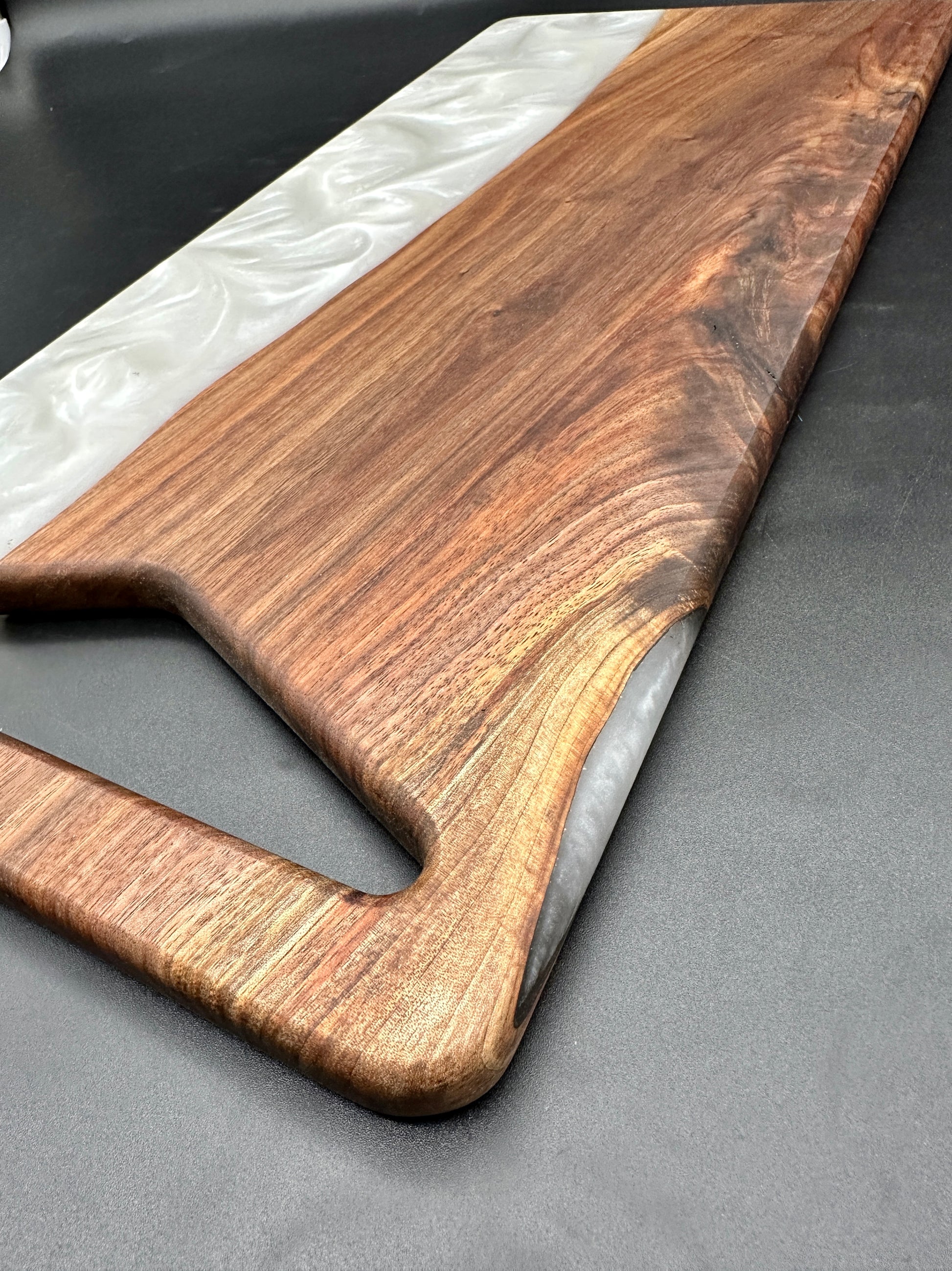 Walnut and pearl white resin board with triangle cut out handle. Perfect for serving appetizers, cheese or charcuterie.